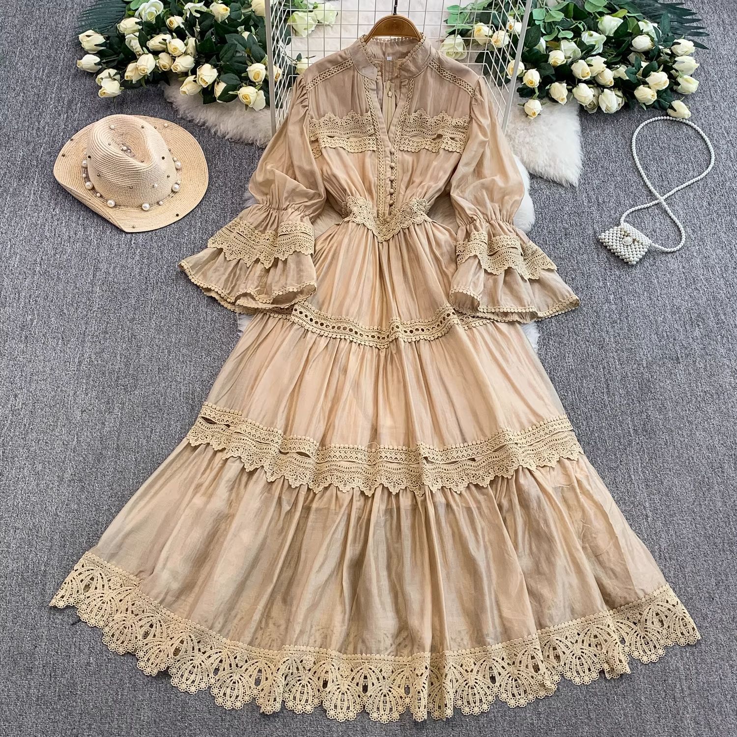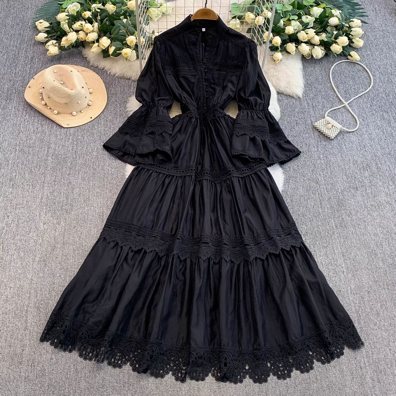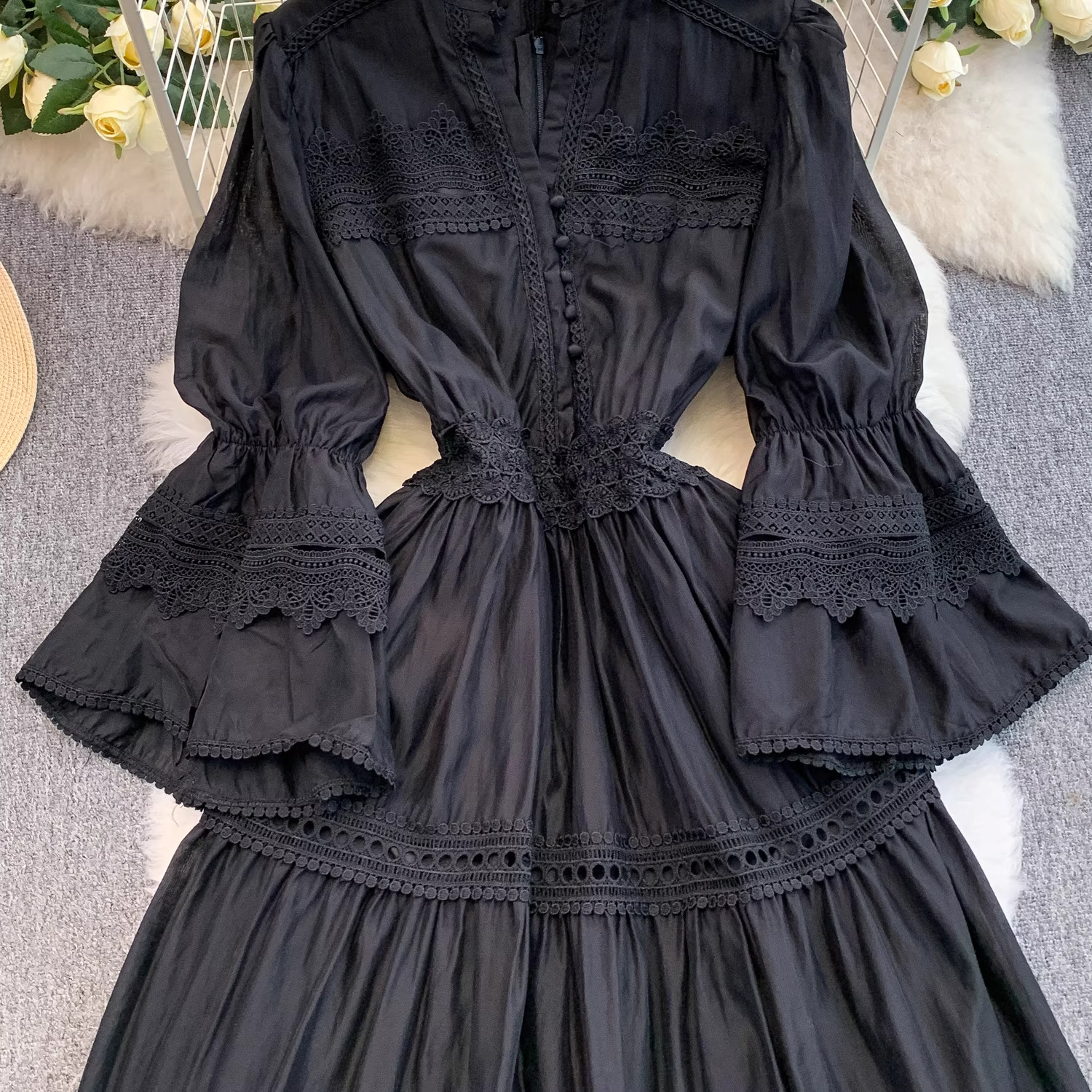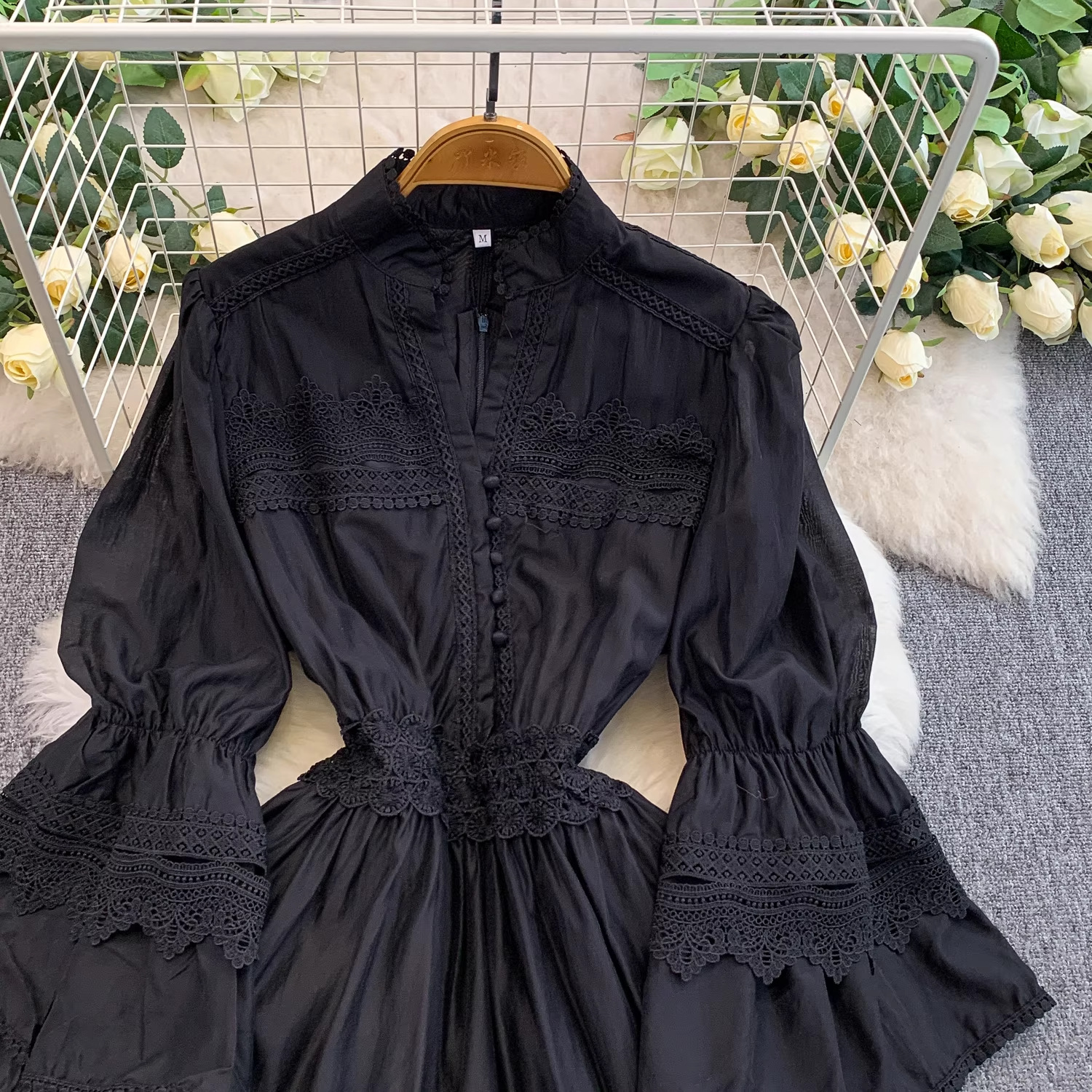 法式复古宫廷风蕾丝拼接立领喇叭袖连衣裙女名媛收腰显瘦大摆长裙