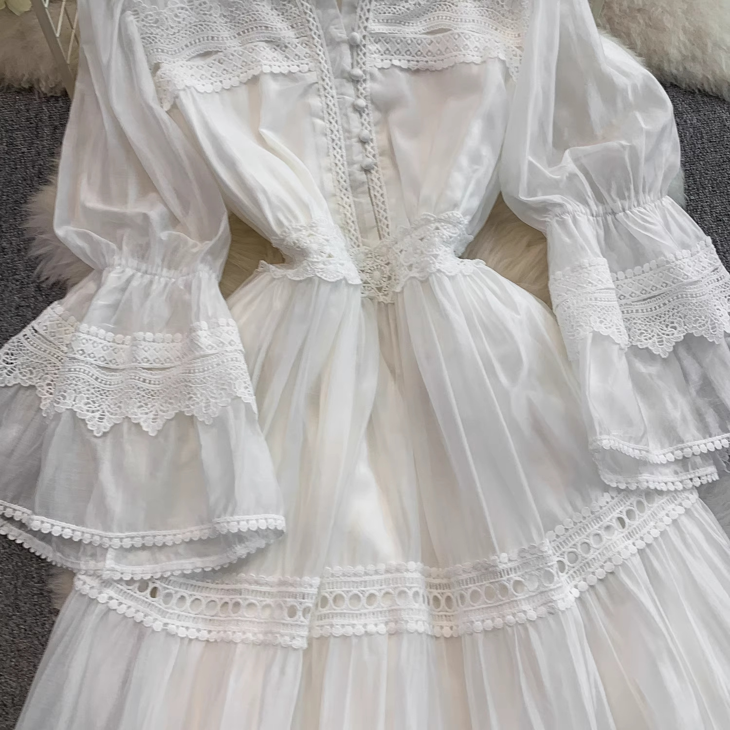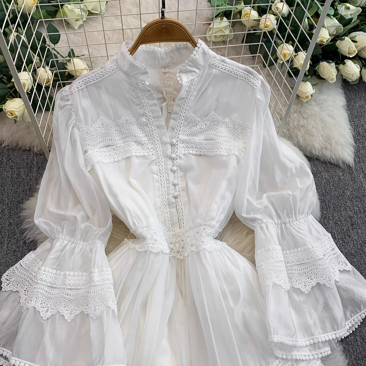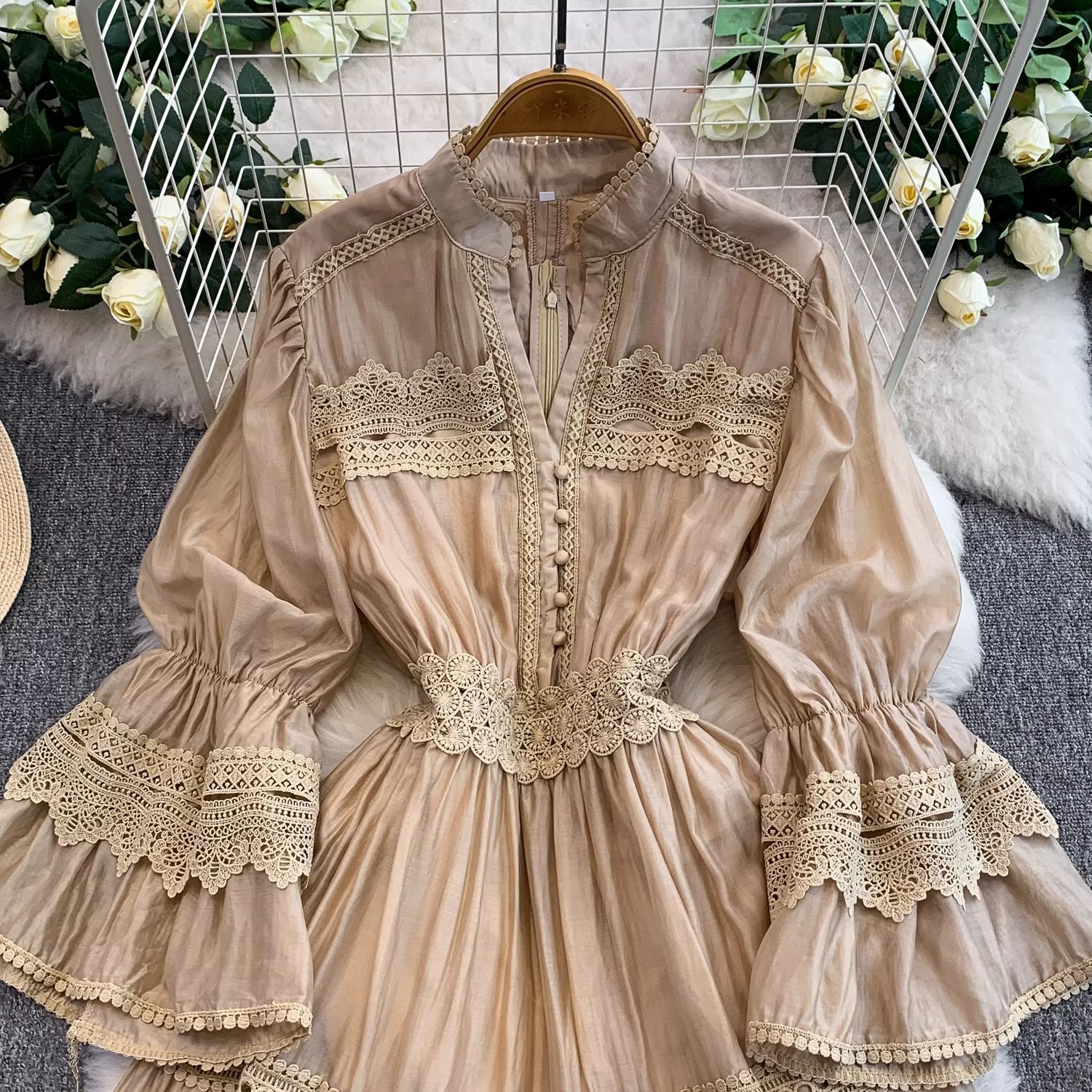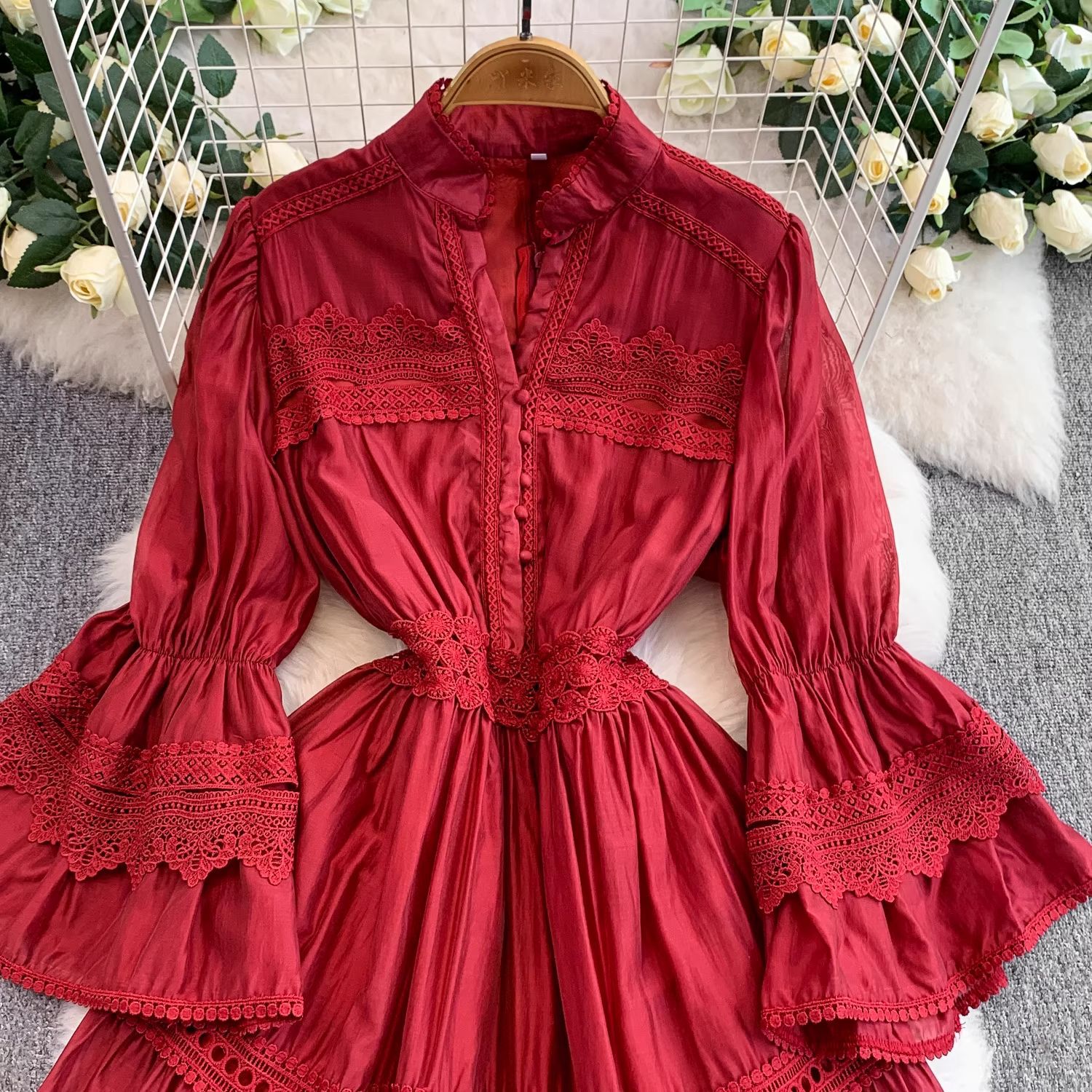 法式复古宫廷风蕾丝拼接立领喇叭袖连衣裙女名媛收腰显瘦大摆长裙