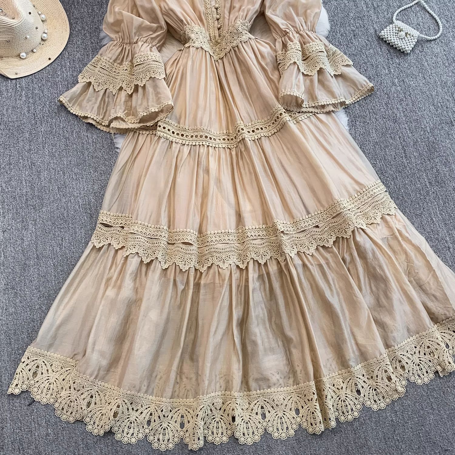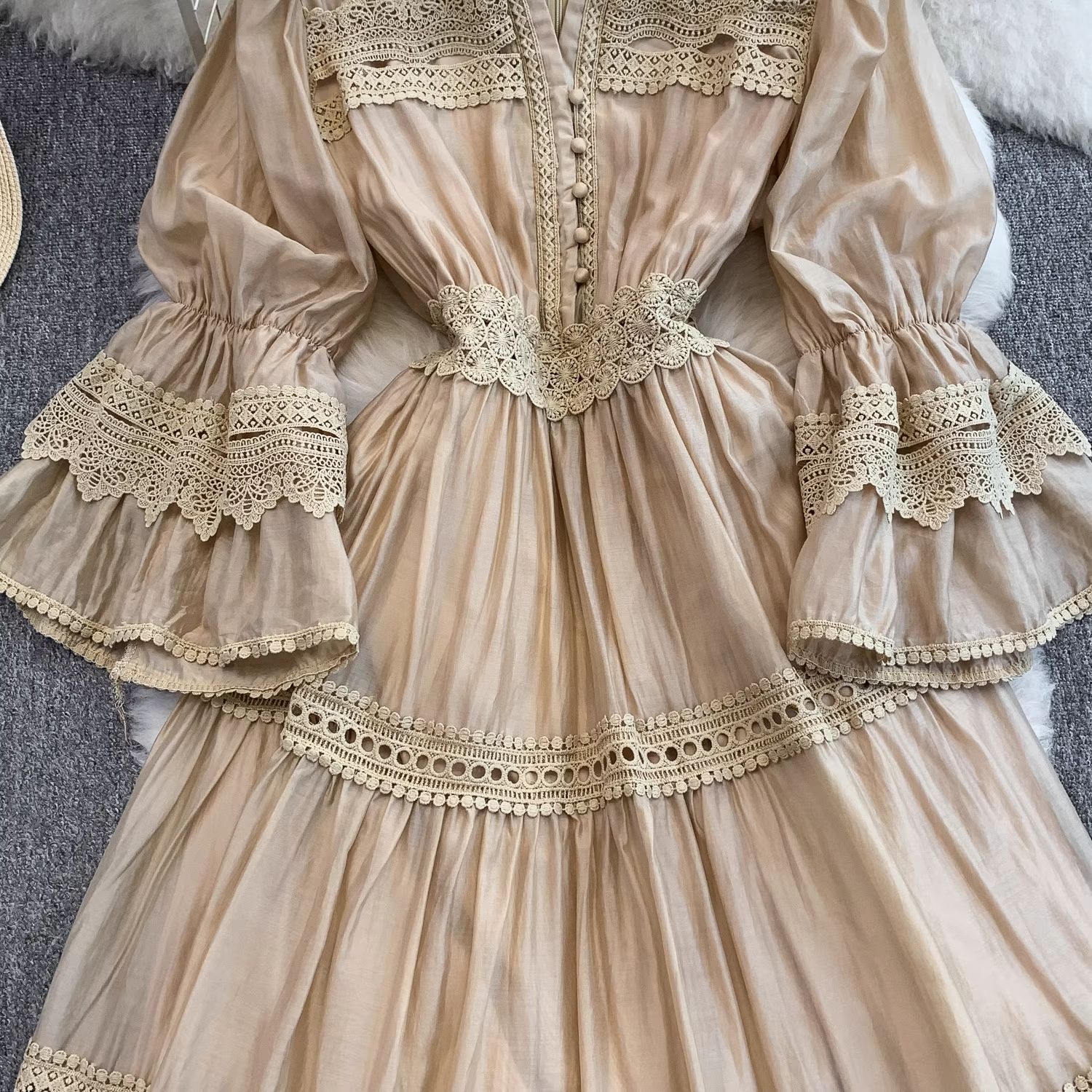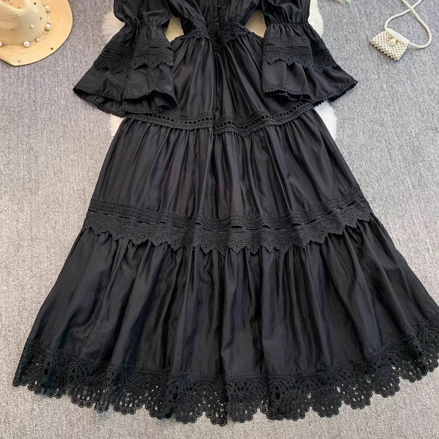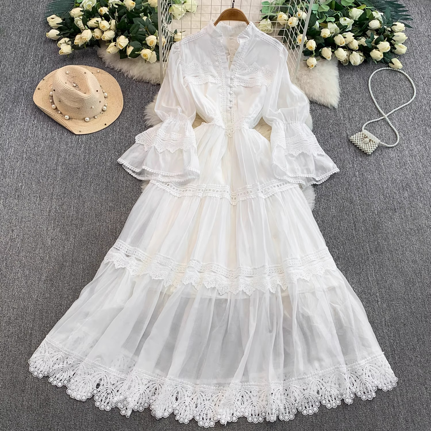 法式复古宫廷风蕾丝拼接立领喇叭袖连衣裙女名媛收腰显瘦大摆长裙