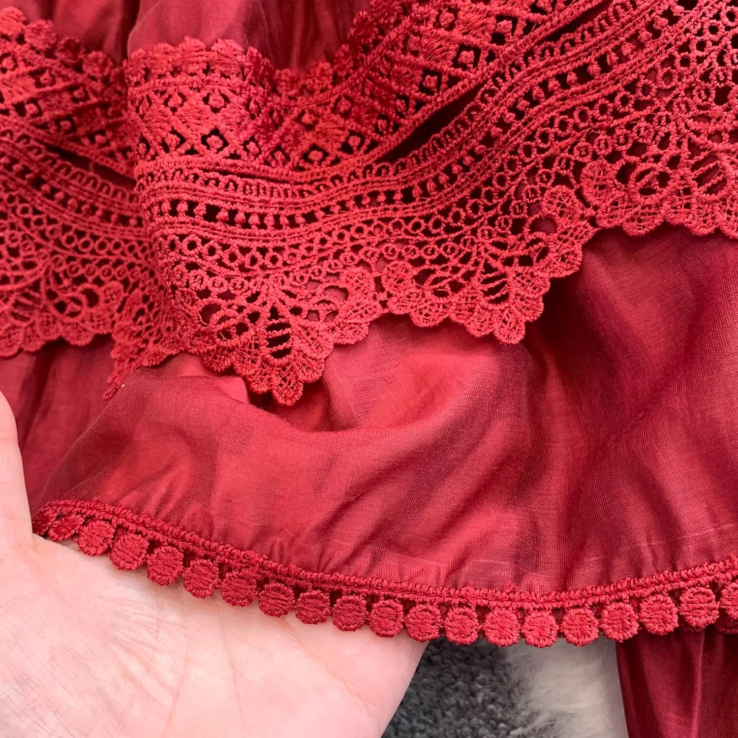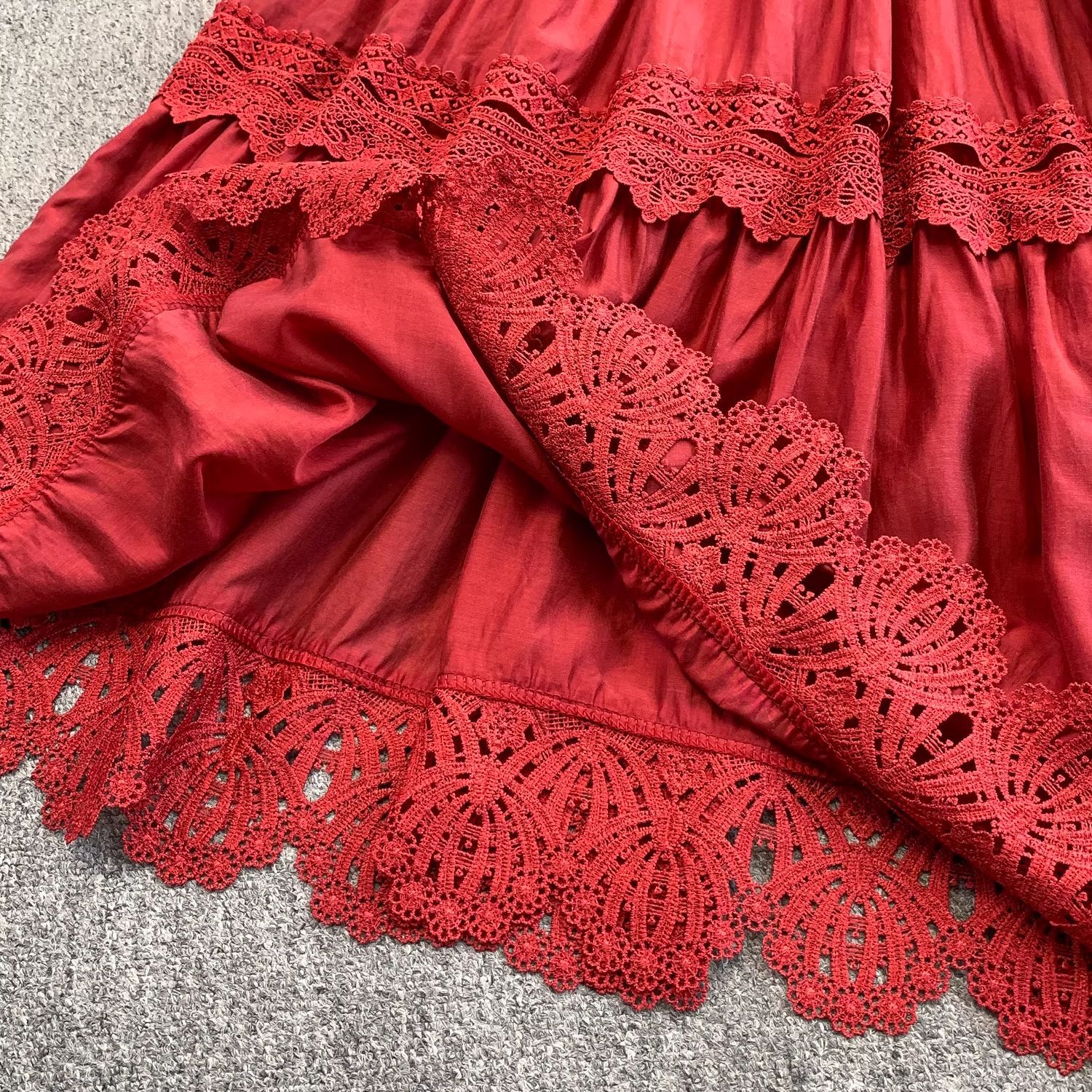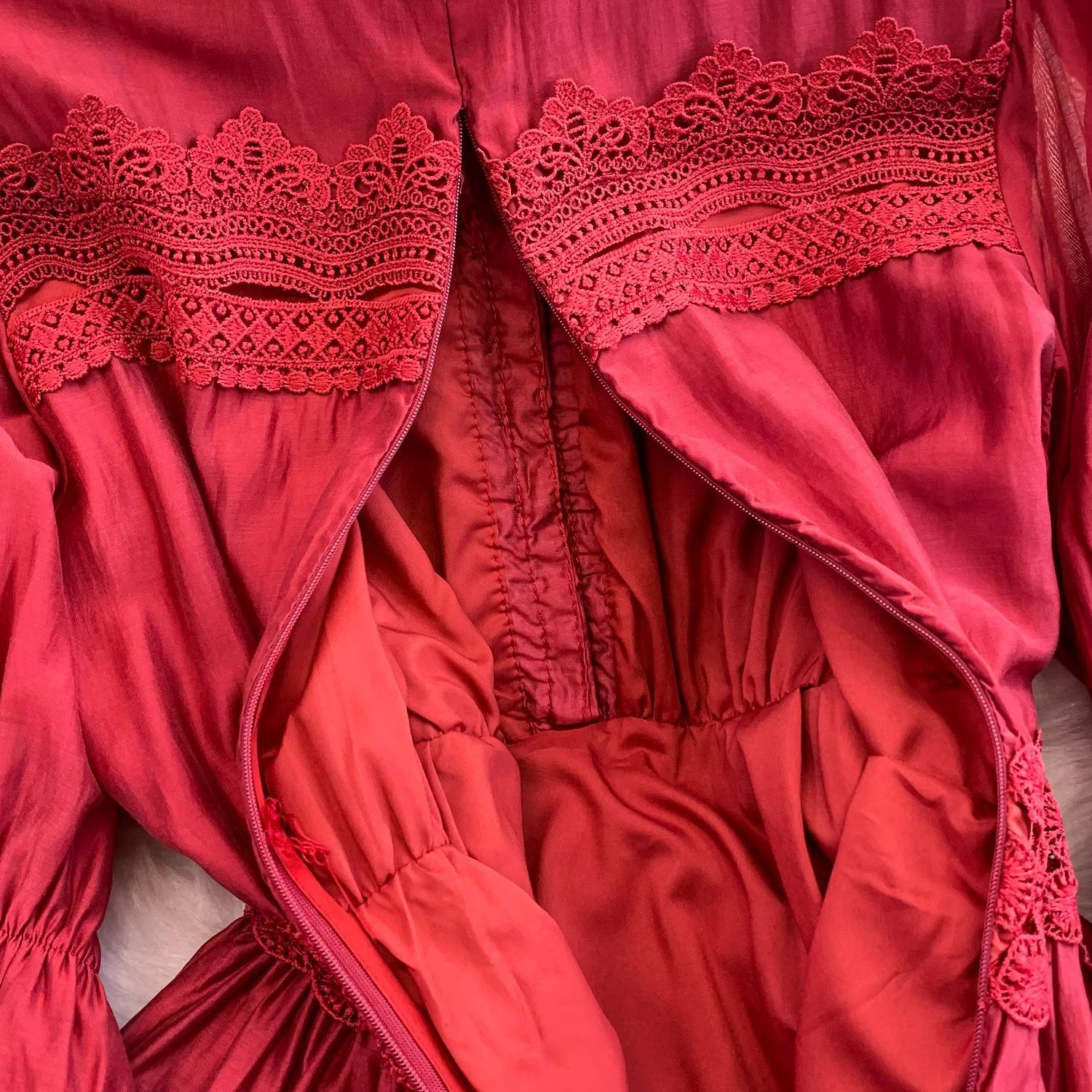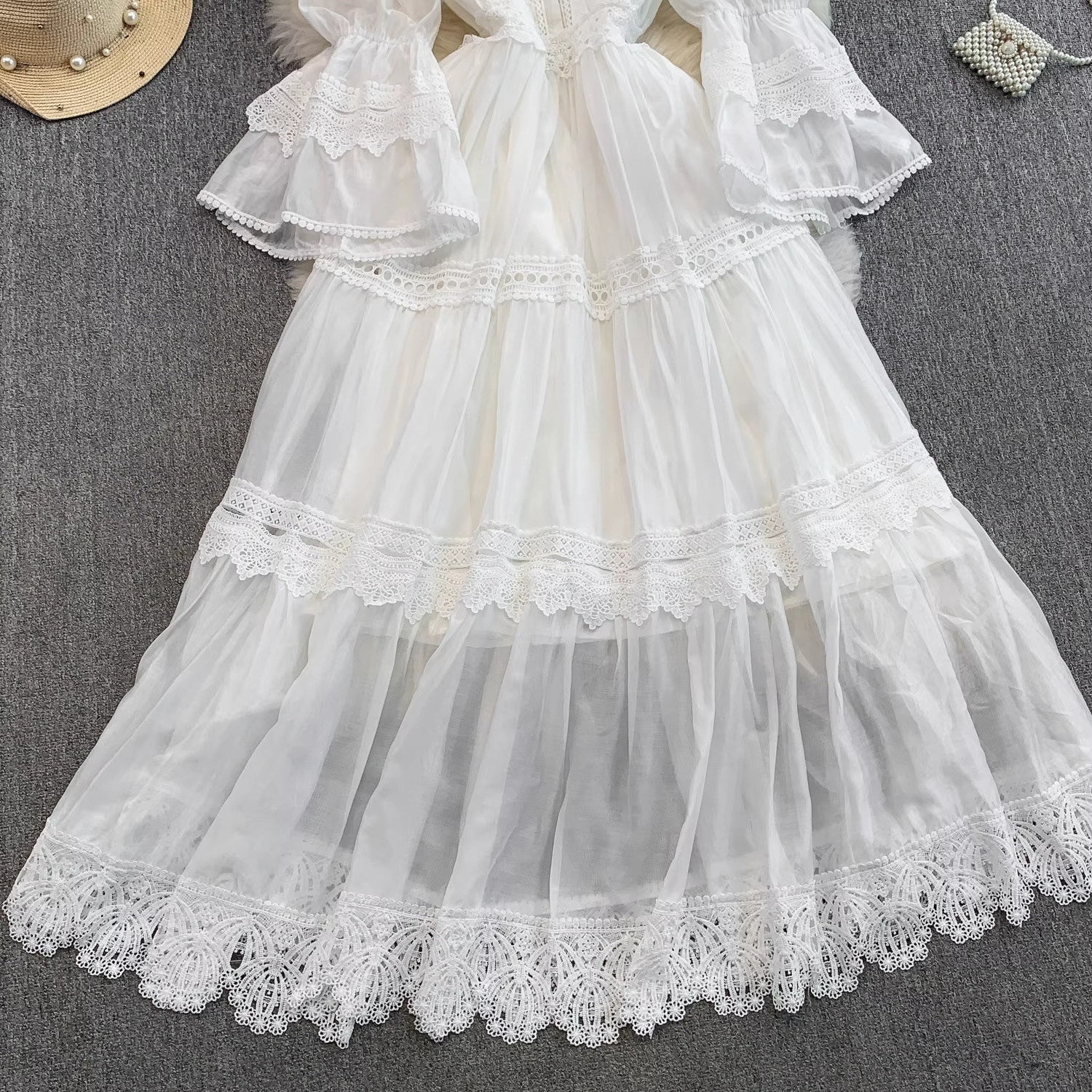 法式复古宫廷风蕾丝拼接立领喇叭袖连衣裙女名媛收腰显瘦大摆长裙
