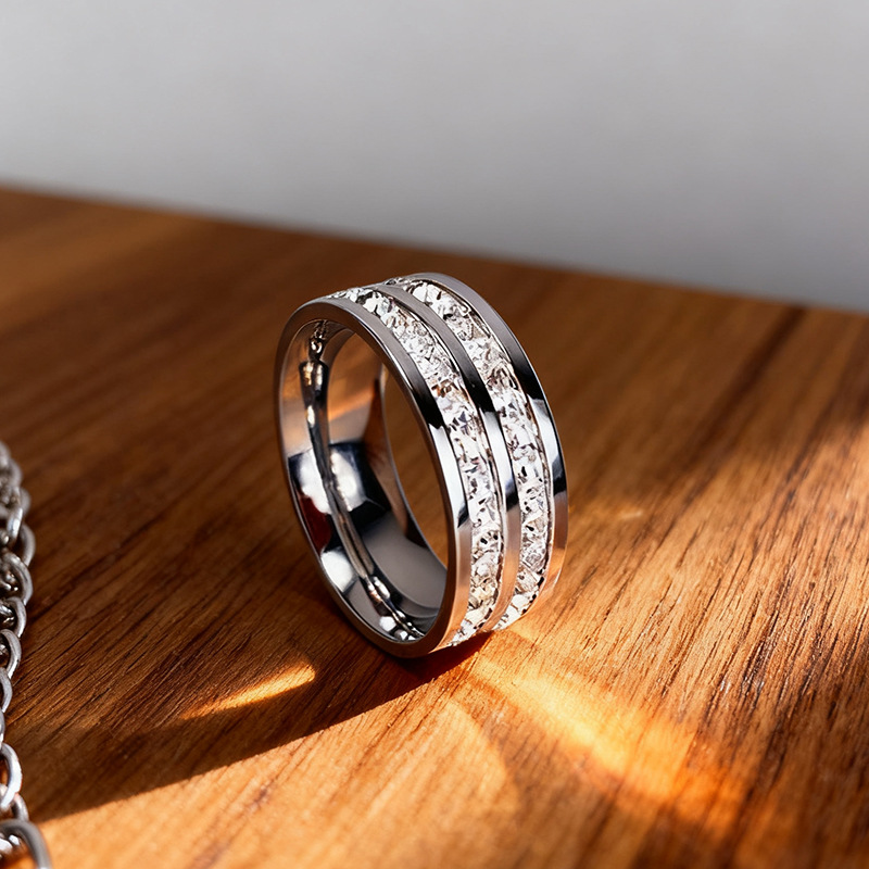 韓国版のハイエンドの軽い高級リングステンレス鋼ジュエリー女性のための星空デザイン二列フルダイヤモンド象嵌ダイヤモンドカップルリング