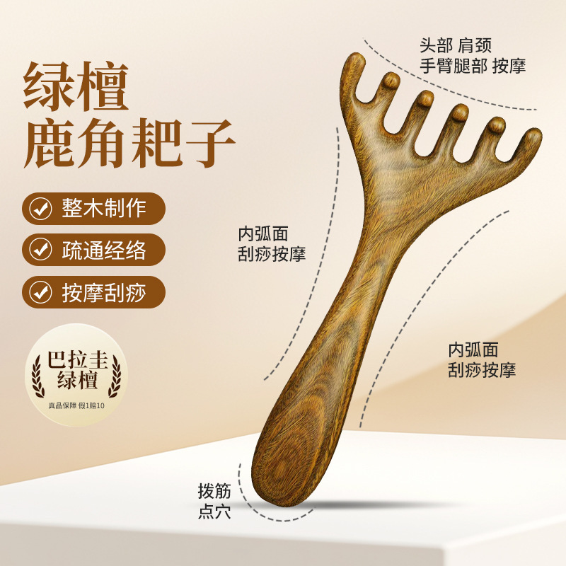 益发绿檀鹿角耙子五爪头部按摩经络梳子头疗檀木头皮淋巴刮痧工具