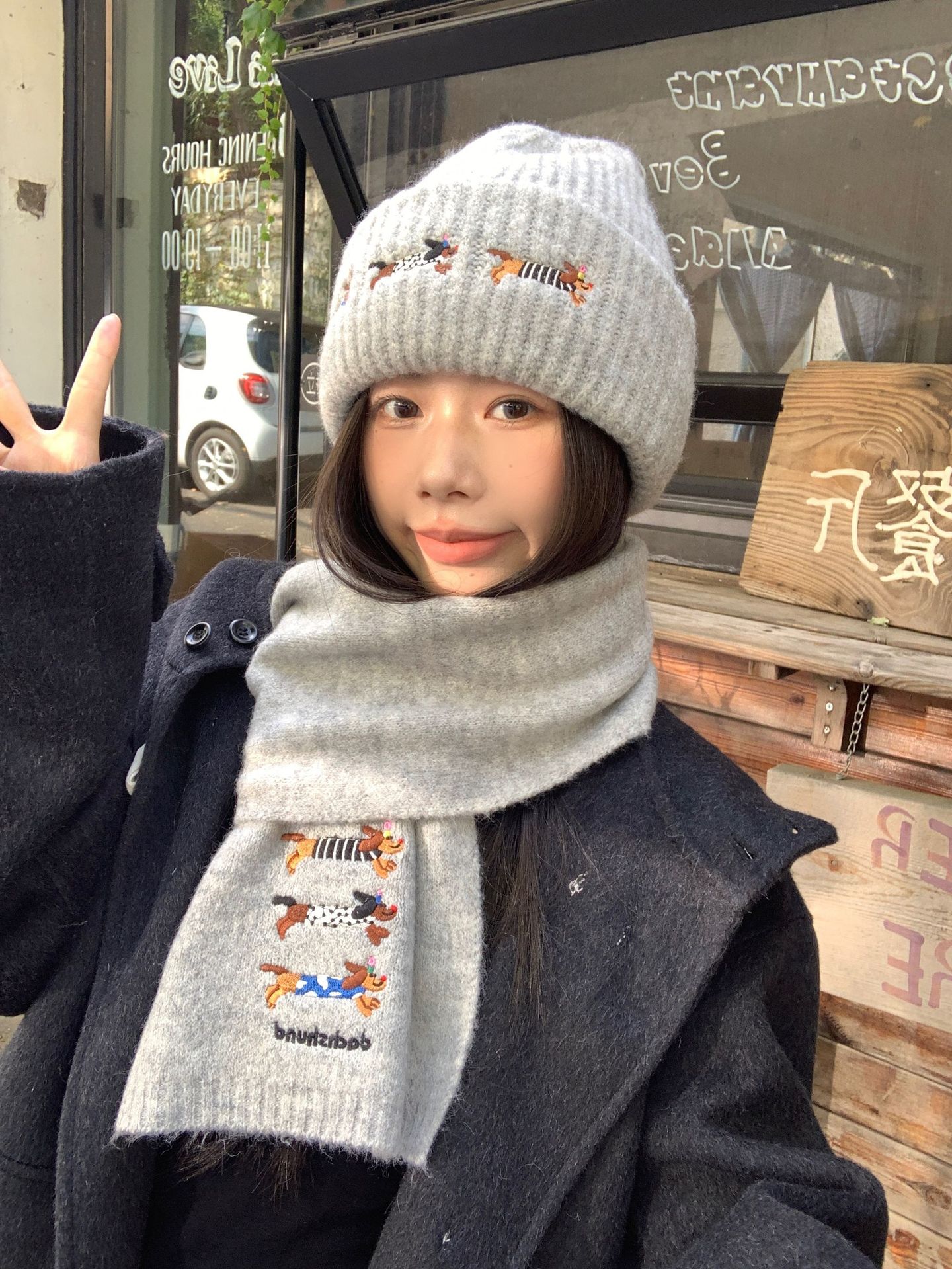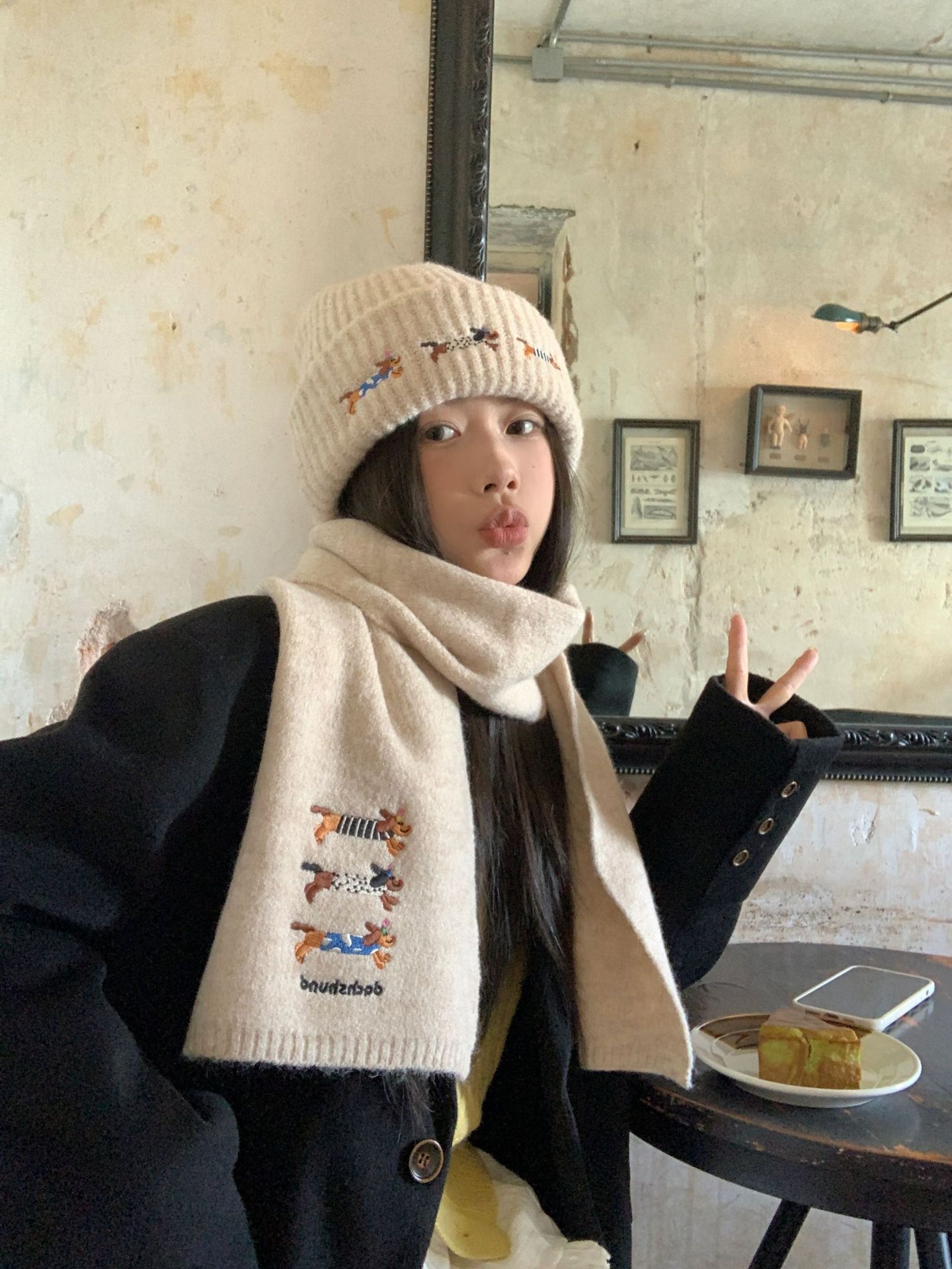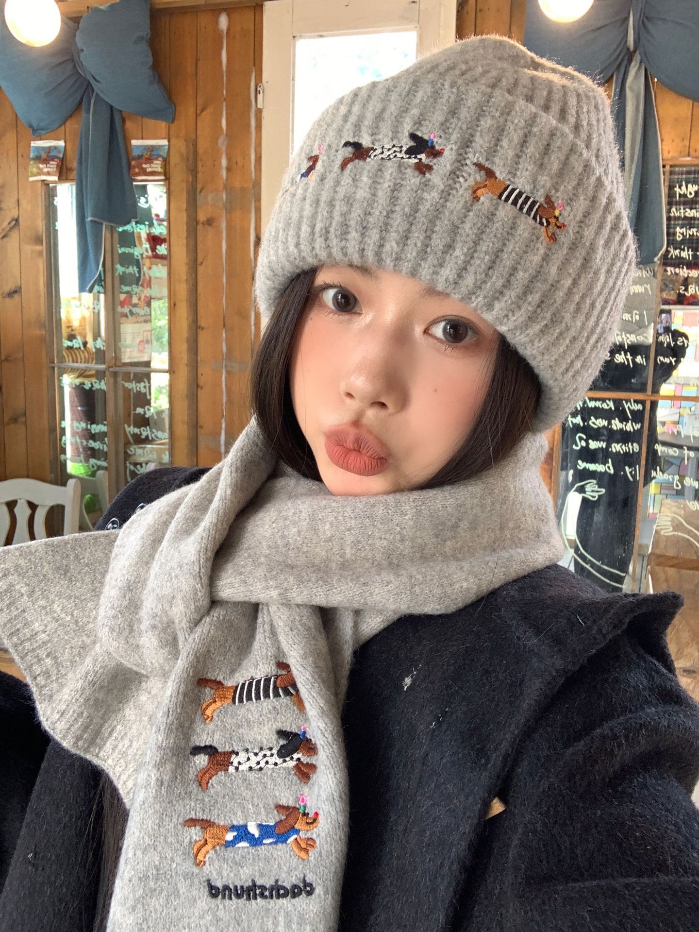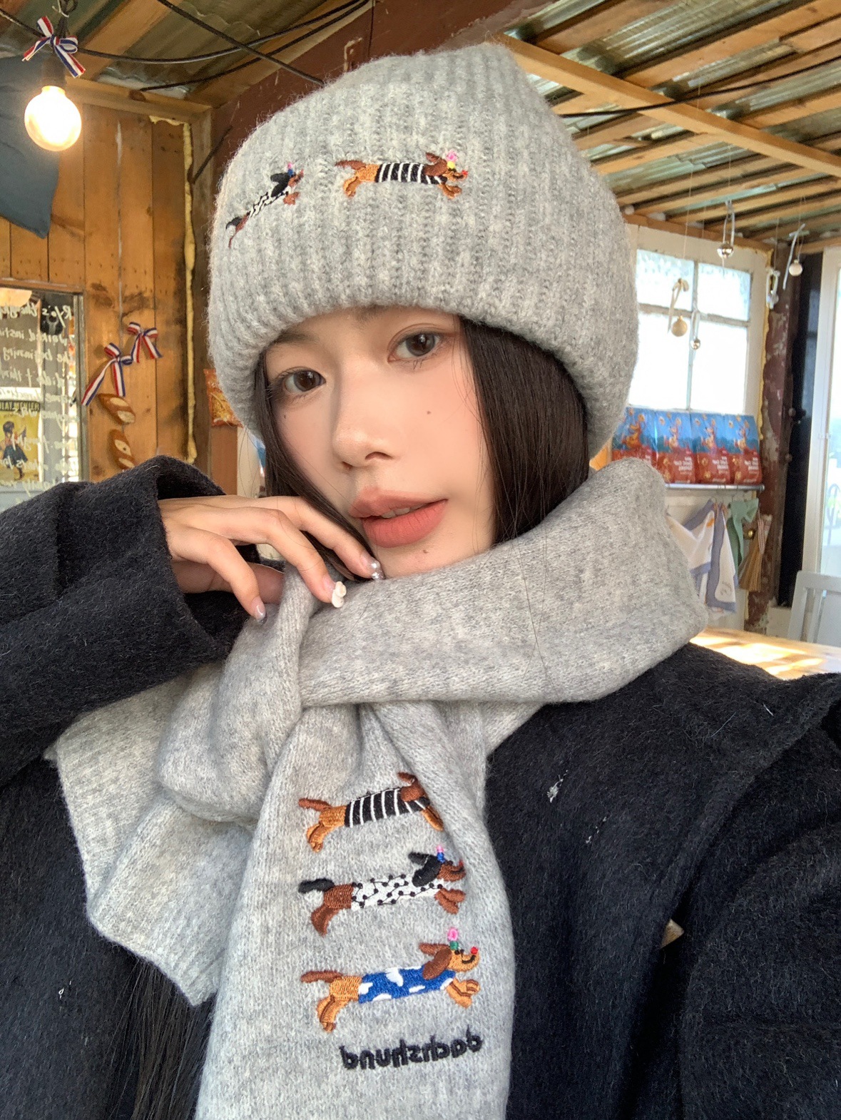 冬季新款帽子围巾套装女可爱腊肠狗毛线帽百搭保暖针织帽时尚围巾
