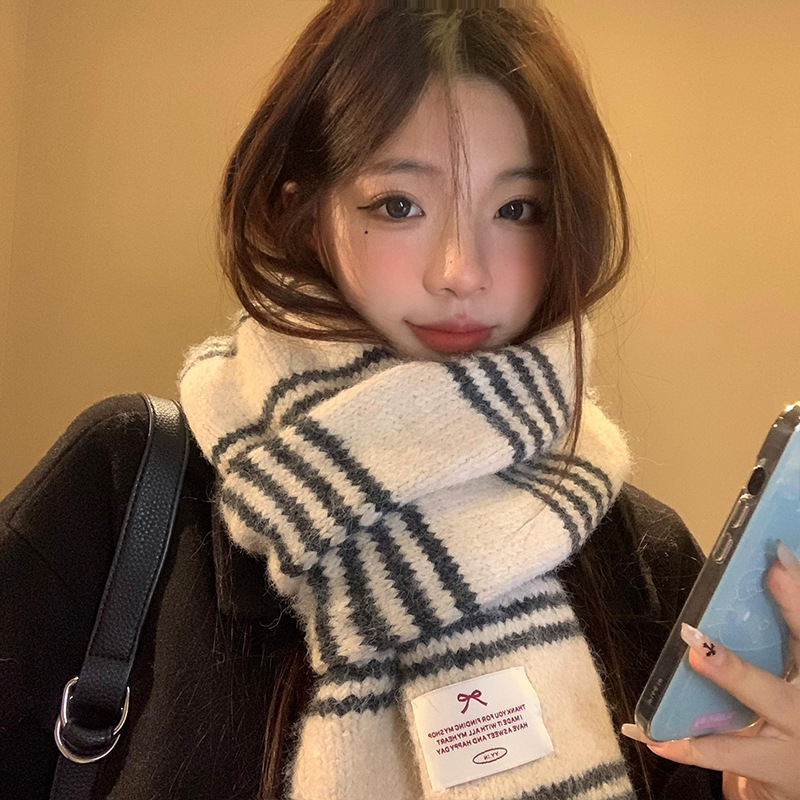 韩系氛围感条纹针织围巾女2025年秋冬高级感加厚保暖百搭防寒围脖