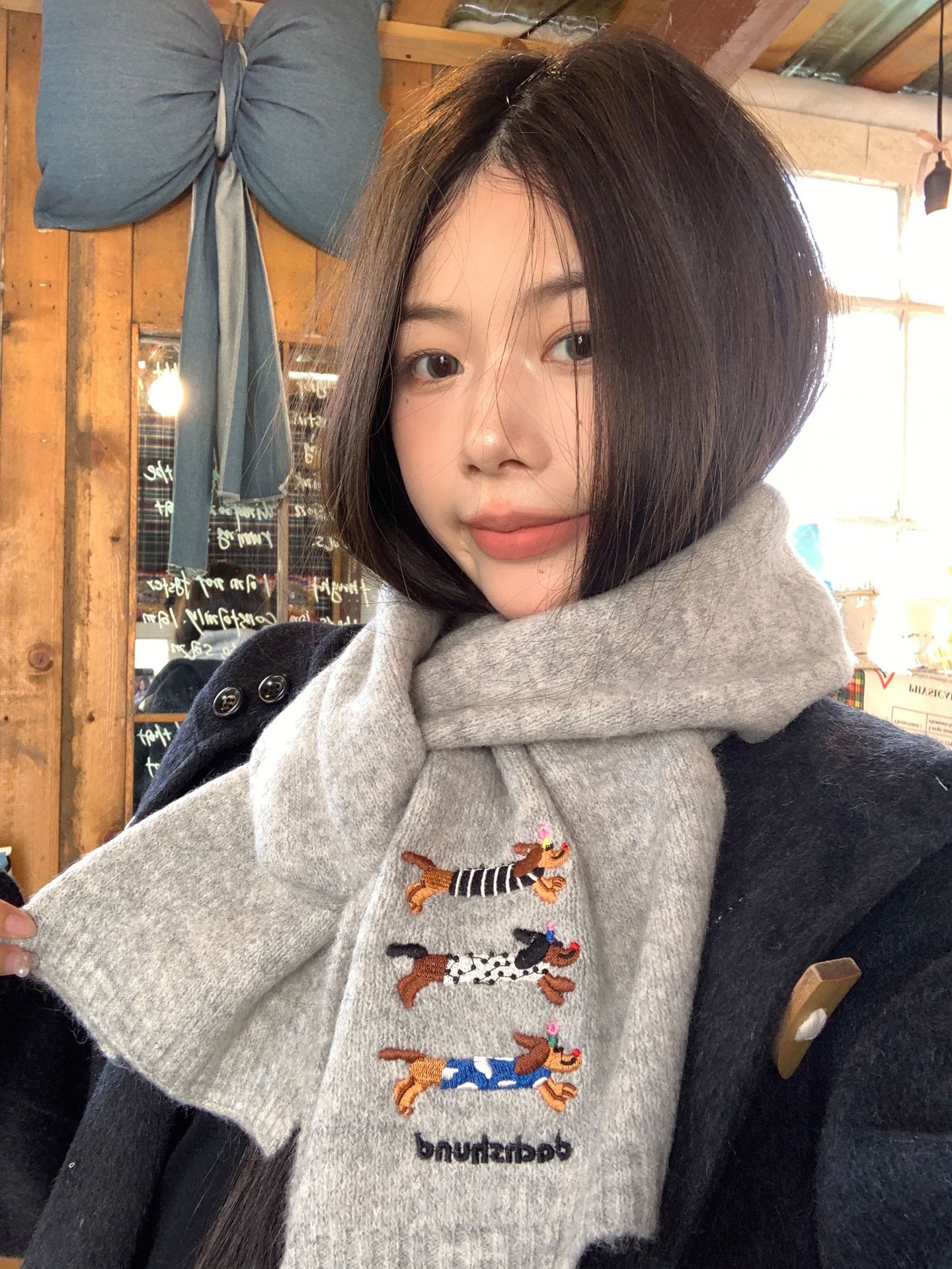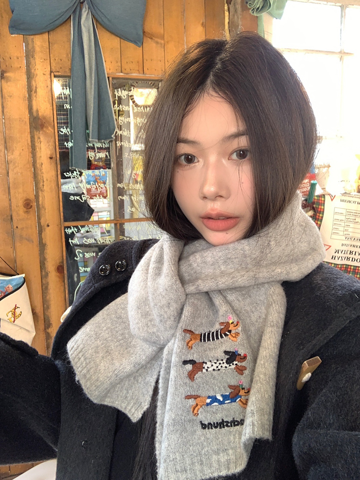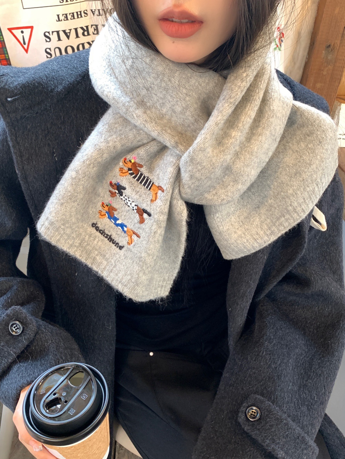 日系のかわいい子犬の刺繍のマフラーの女性の秋の冬の2024の新型の保温の百合学院の風のメリヤスのマフラーの潮