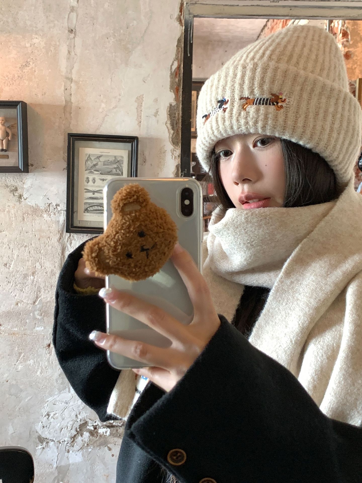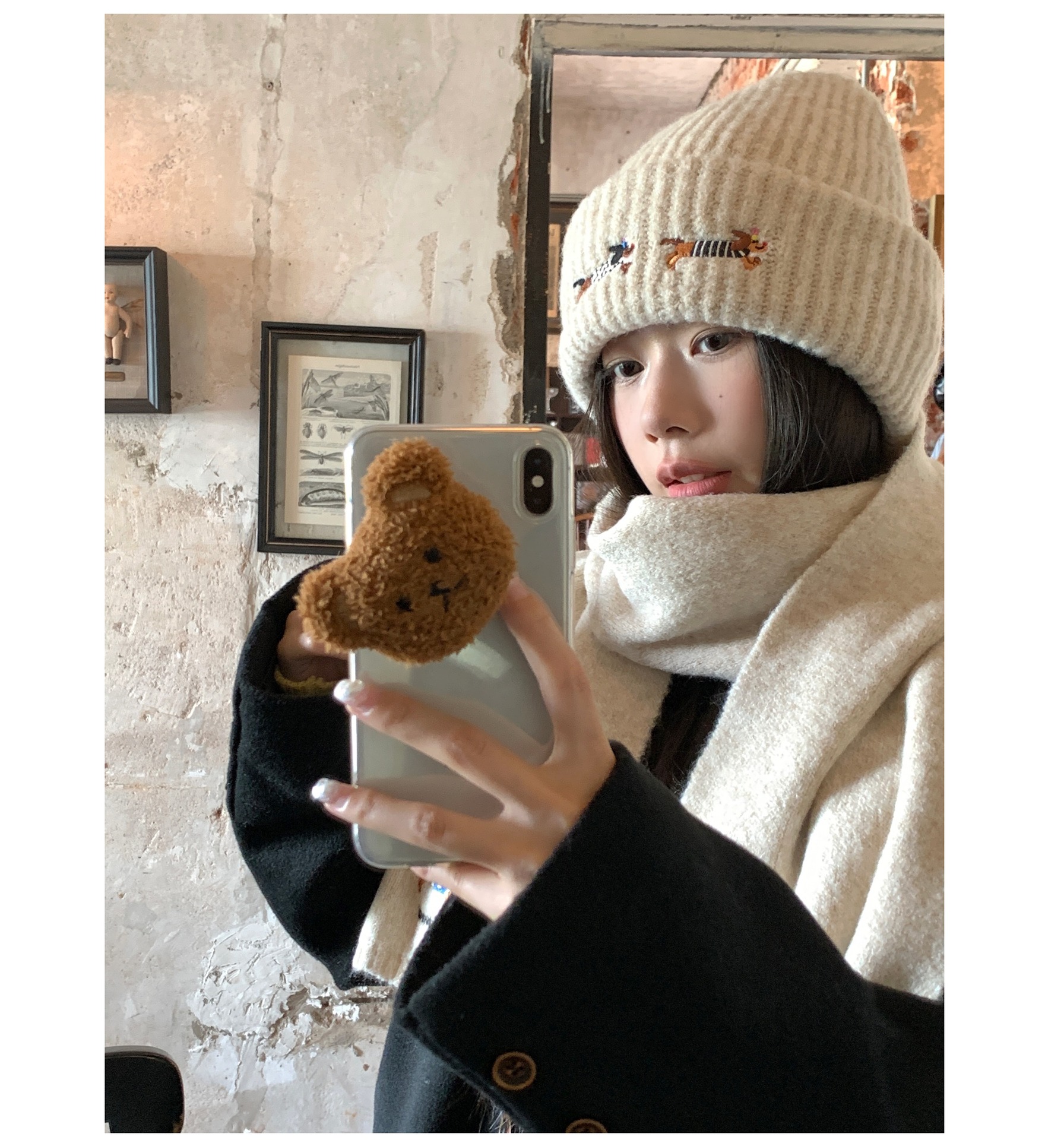 ドーパミンかわいい熊刺繍ニットマフラー女性冬高級感保温防寒百合学生毛糸マフラー