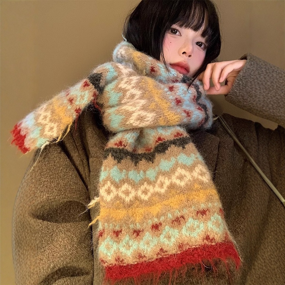 フェア島風ニットマフラーの女性秋冬の高級感が色にぶつかって、保温韓国系の雰囲気感があります。