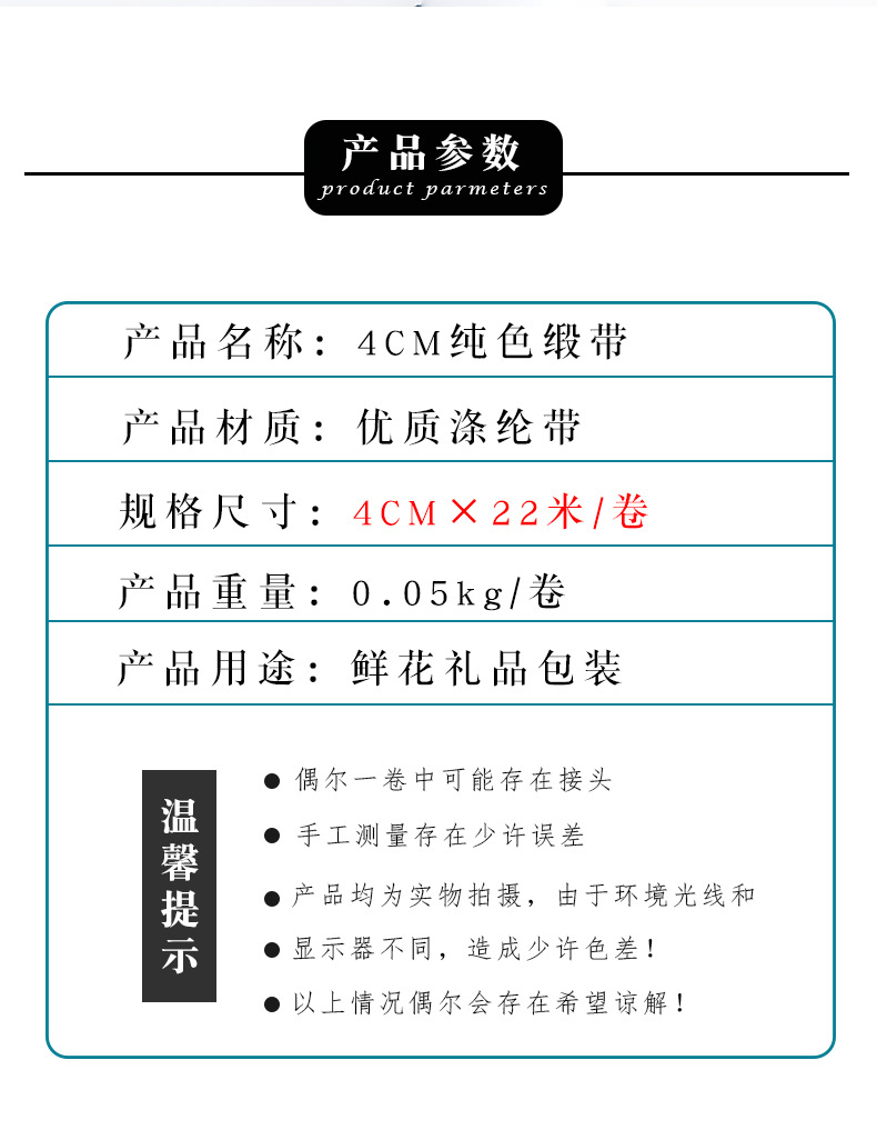 规格型号 01#白色【4CM缎带】22米/卷,04#浅粉【4CM缎带】22米/卷,05#深粉【4CM缎带】22米/卷,07#香槟【4CM缎带】22米/卷,08#米白【4CM缎带】22米/卷,20#天蓝【4CM缎带】22米/卷,26#大红【4CM缎带】22米/卷,27#玫红【4CM缎带】22米/卷,32#深咖【4CM缎带】22米/卷,33#酒红【4CM缎带】22米/卷,34#紫红【4CM缎带】22米/卷,39#黑色【4CM缎带】22米/卷,40#宝蓝【4CM缎带】22米/卷,46#深紫【4CM缎带】22米/卷,52#果绿【4CM缎带】22米/卷,57#荧光绿【4CM缎带】22米/卷,59#浅灰【4CM缎带】22米/卷,95#军绿【4CM缎带】22米/卷,103#墨绿【4CM缎带】22米/卷,104#卡其【4CM缎带】22米/卷,113#浅紫【4CM缎带】22米/卷,117#蒂芙尼蓝【4CM缎带】22米/卷