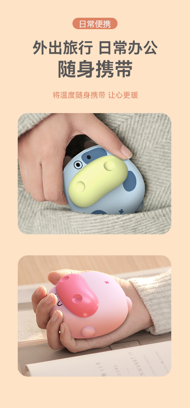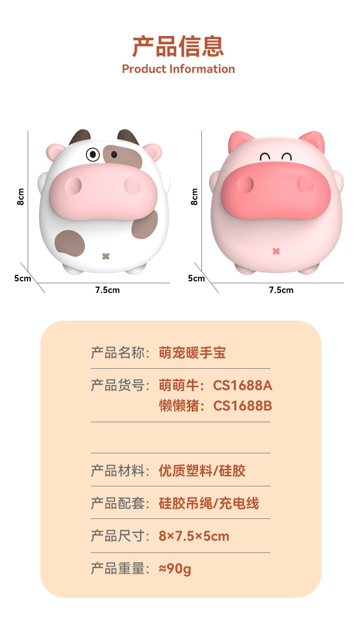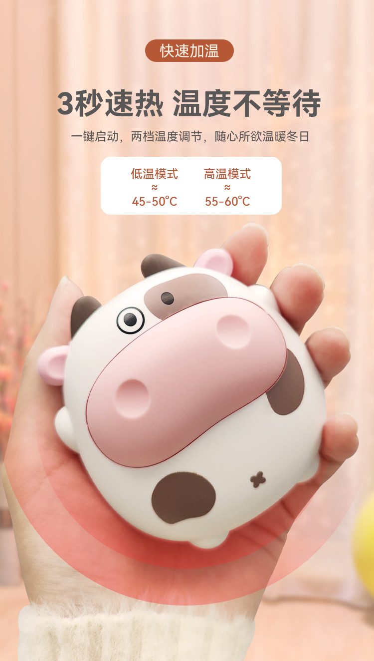 功能:萌趣造型、两档温度调节、快速发热、持久续航、轻巧便携、安全防爆 一份有温度的礼物