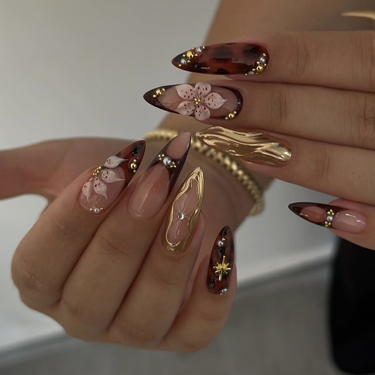 穿戴甲外贸秋冬爆款美甲手工鎏金3D雕花法式深咖豹纹带钻假指甲片