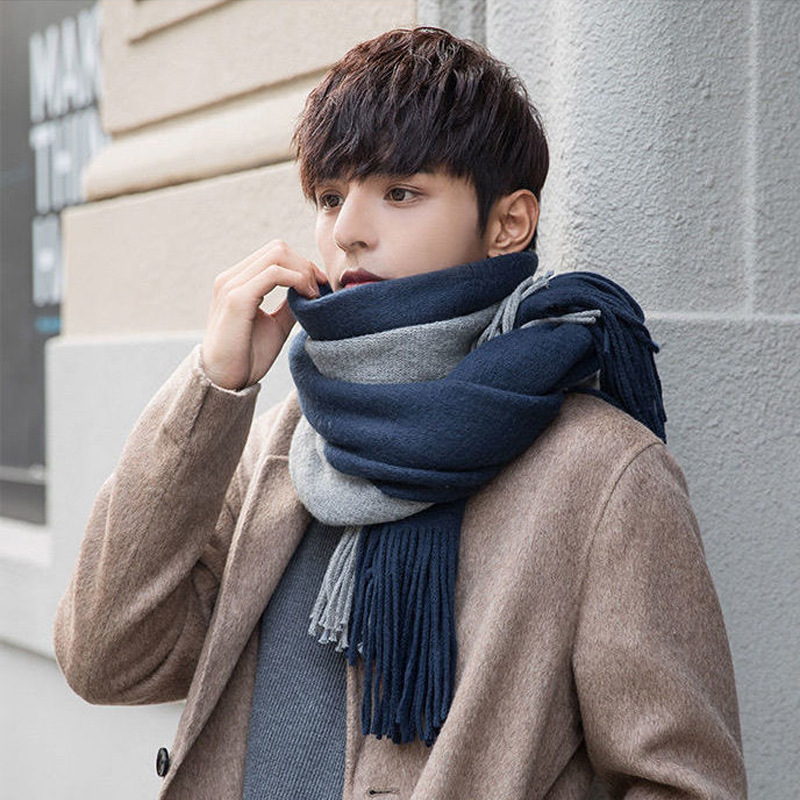 ツートンカラーのスカーフ 2025秋冬 韓国版 新作 イミテーションカシミヤ フリンジ付き 保温 メンズ カラーブロック スカーフ レディース