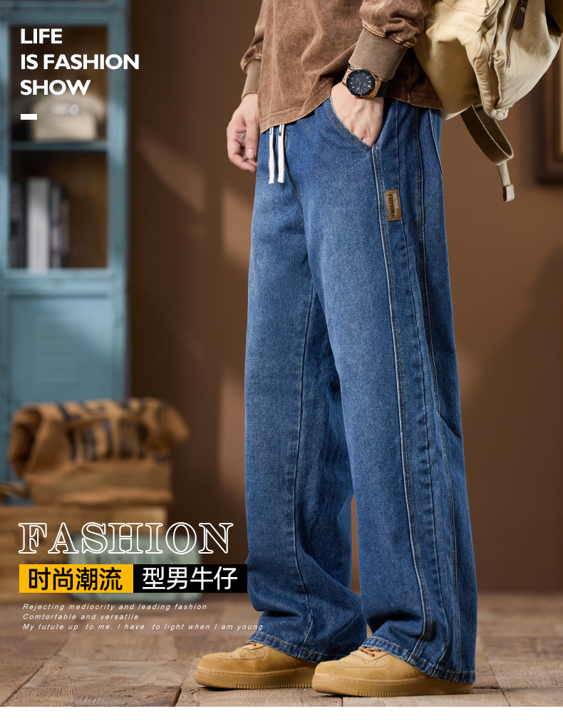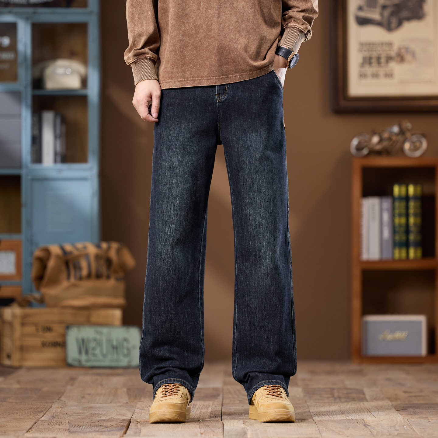 3607|秋冬加长版美式复古弯刀牛仔裤男宽松弹力百搭阔腿直筒长裤
