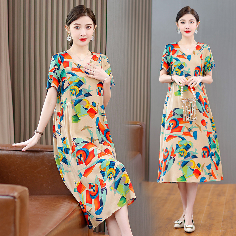 2024新型高級純綿のワンピース夏のファッションはお母さんの中年の綿のプリントのロングスカートを着て膝を越えます。