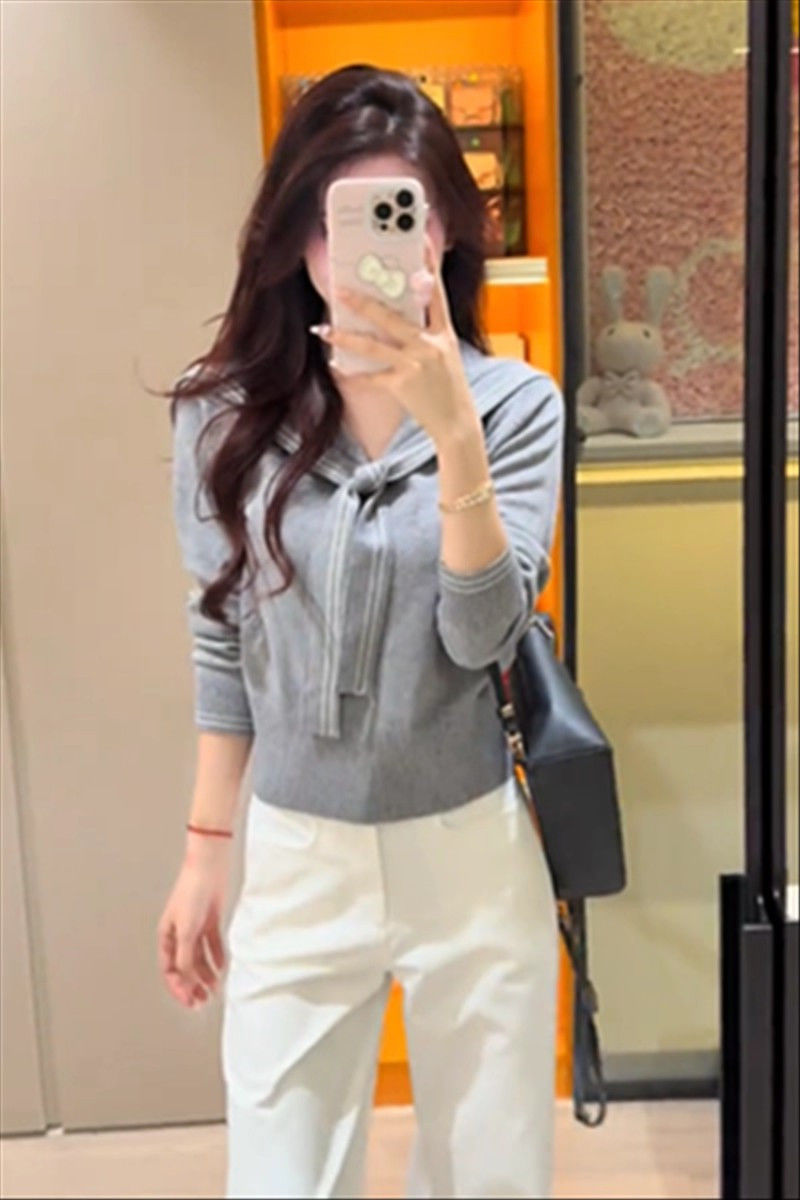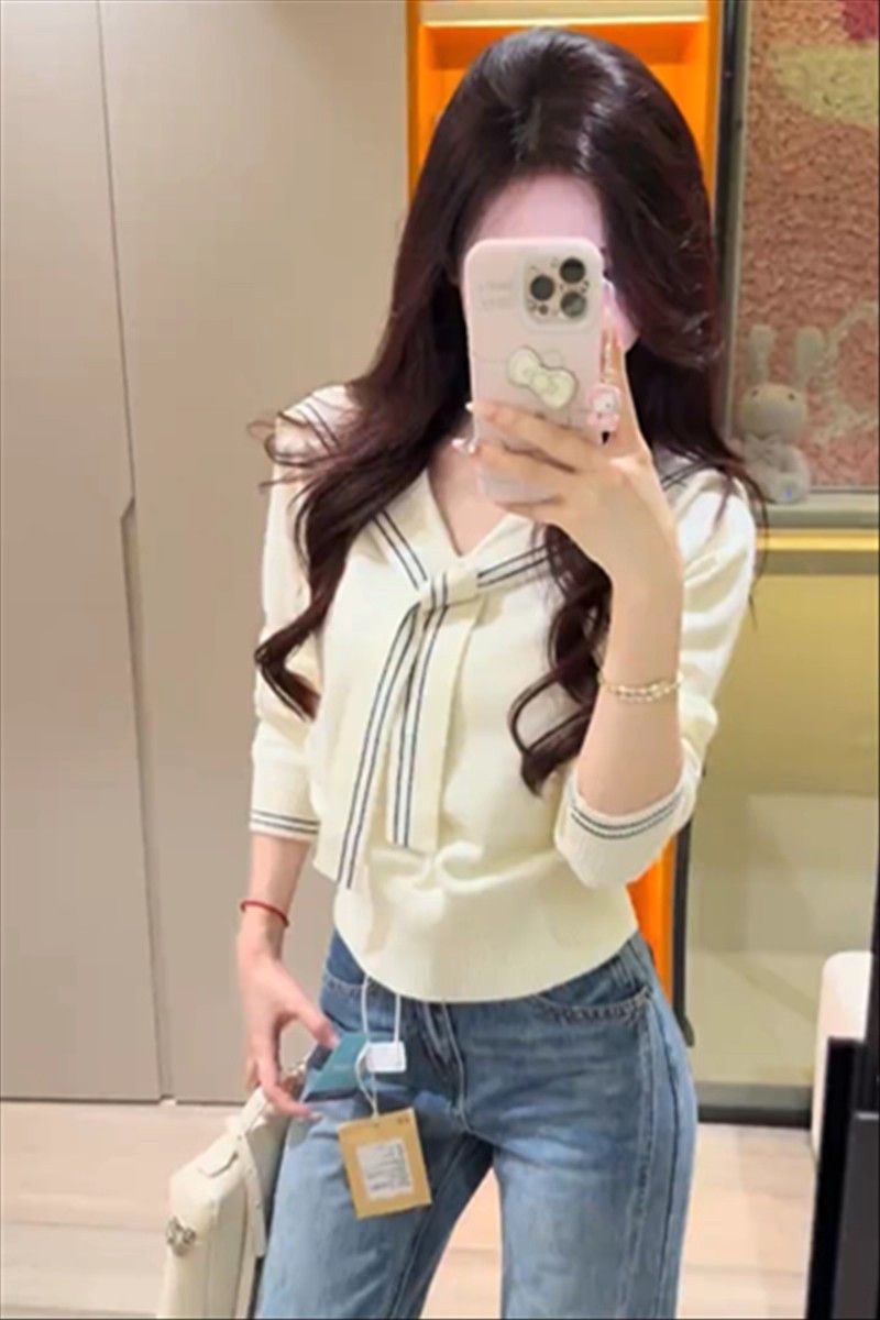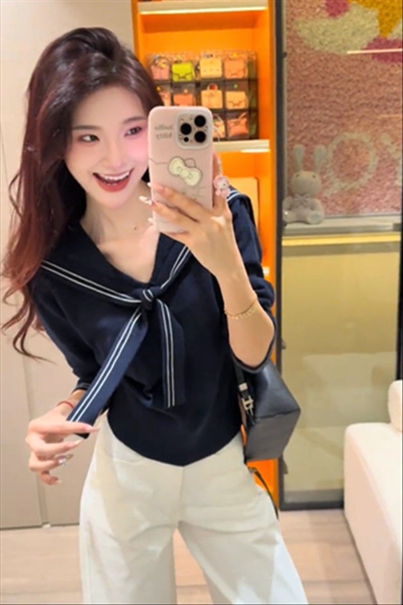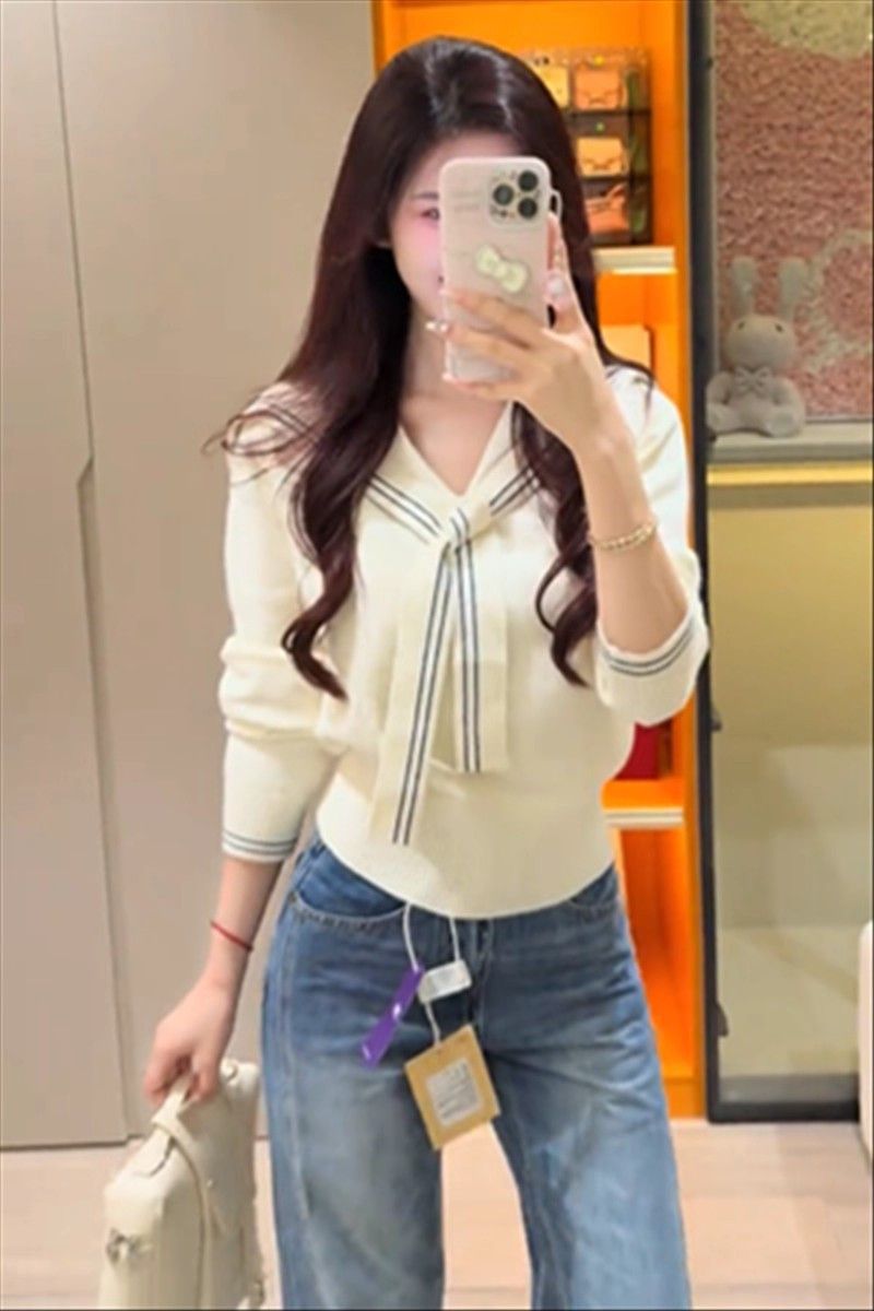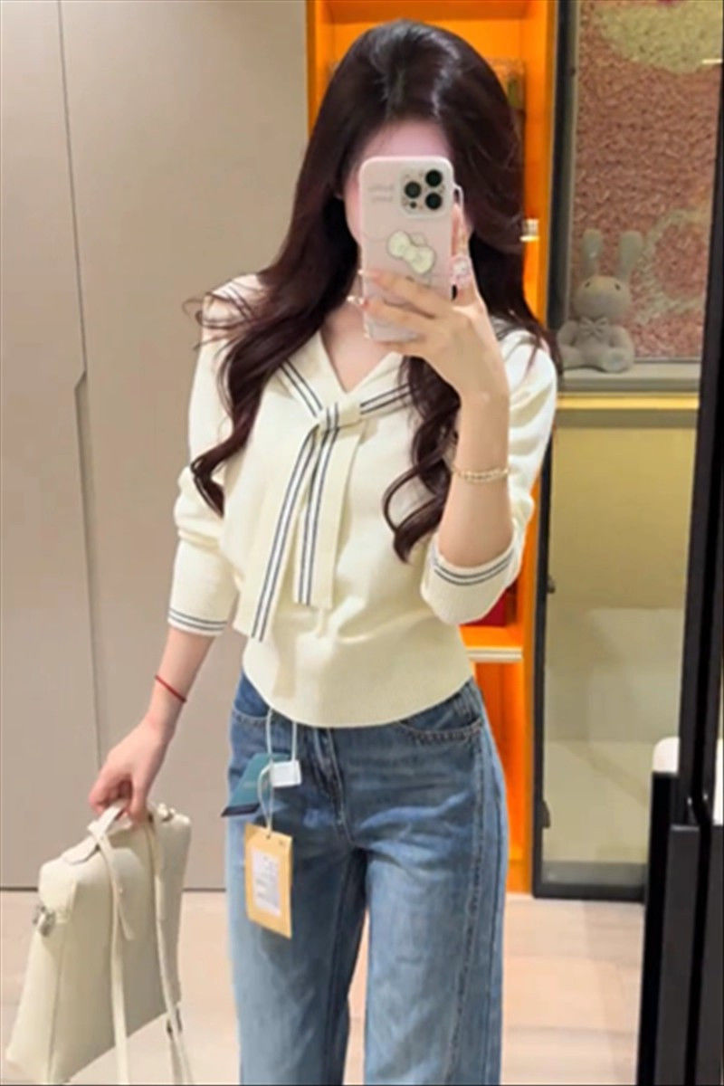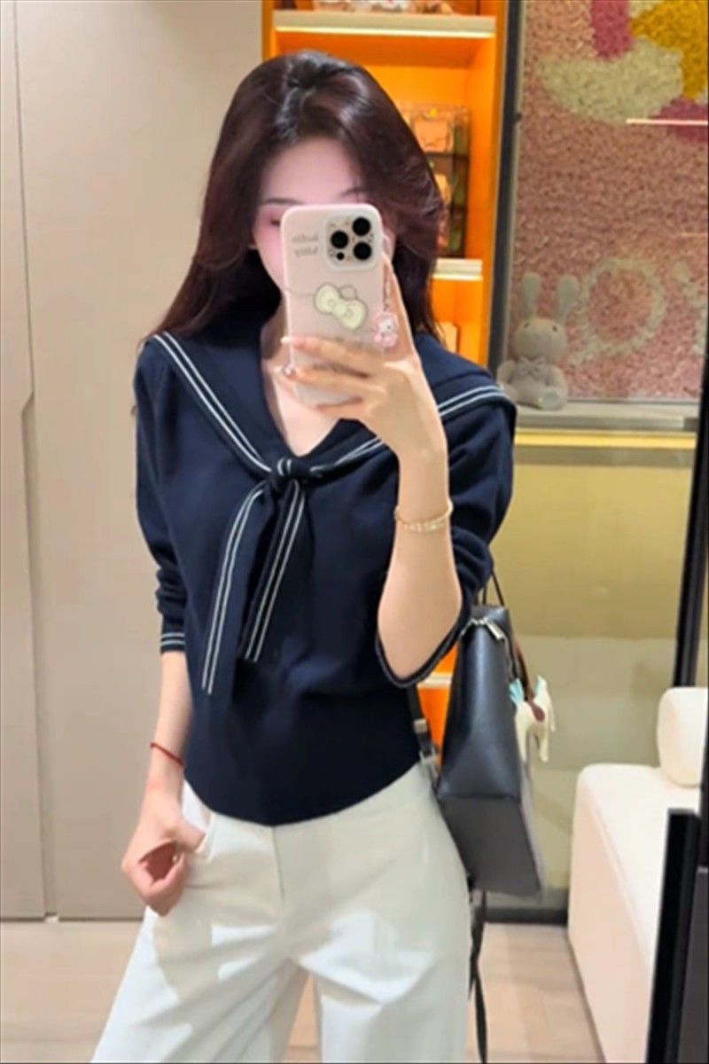 2025早秋新款减龄气质海军领针织衫甜美韩系收腰修身针织长袖上衣