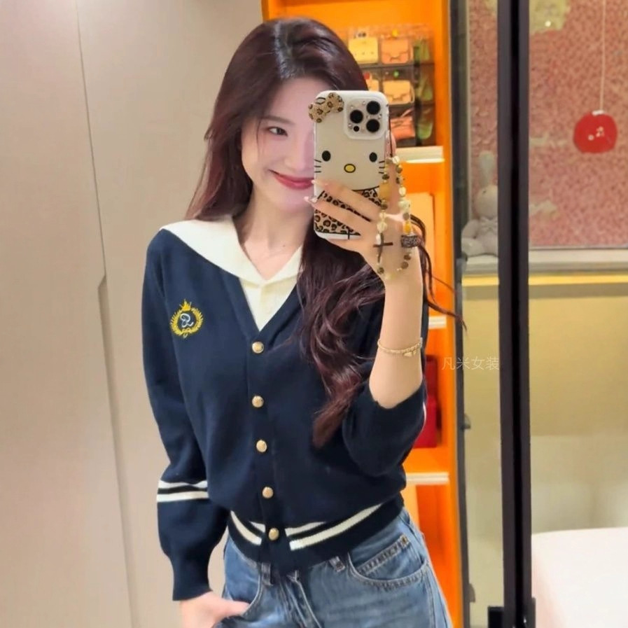 藏青色海军领长袖针织衫女春秋2025秋季新款披肩V领毛衣短款上衣