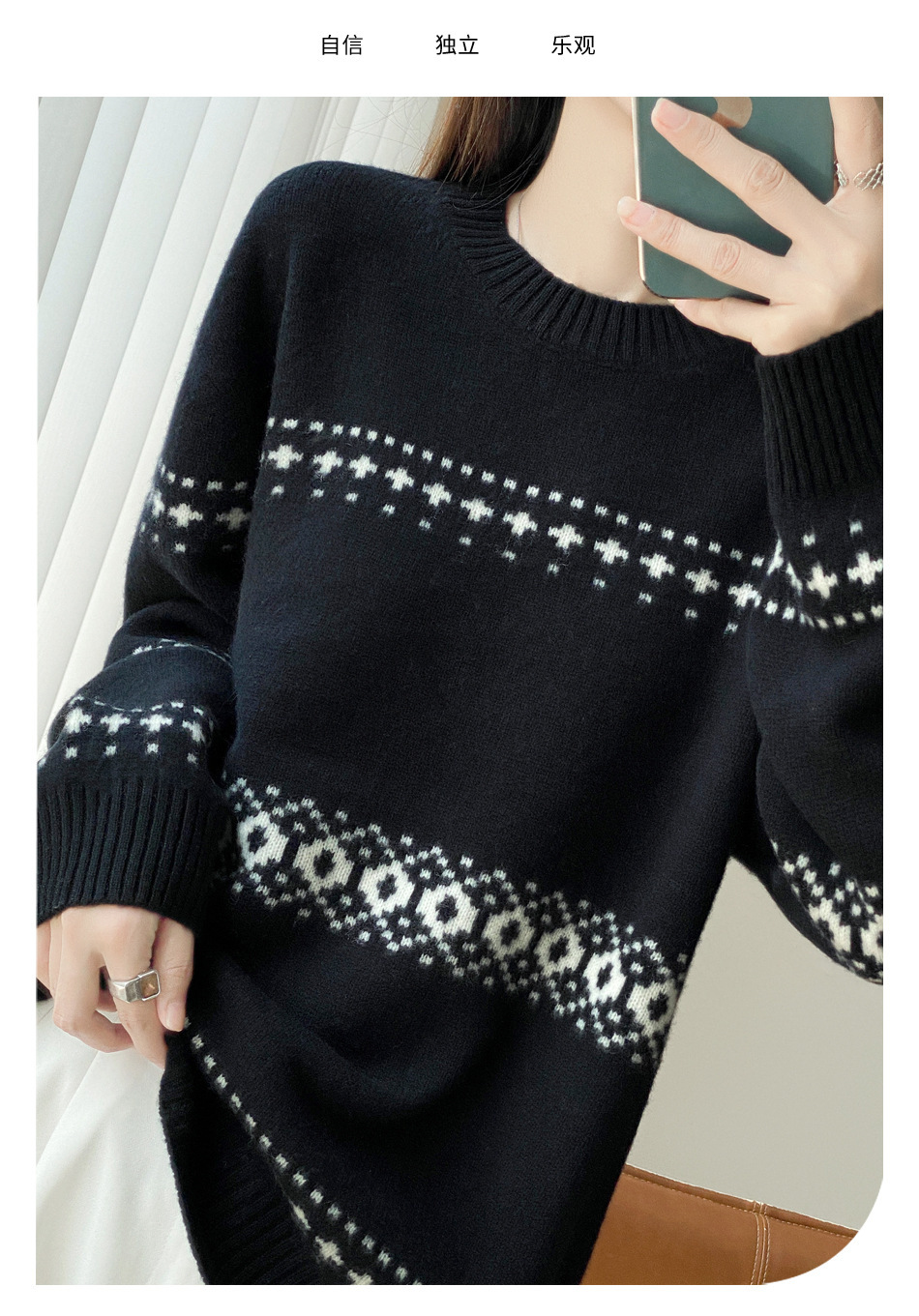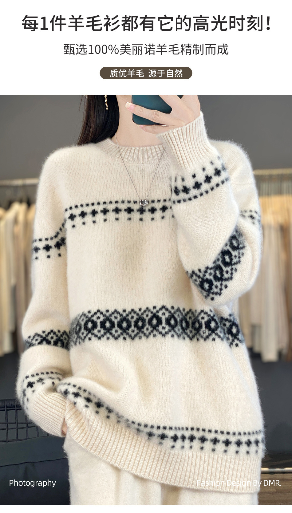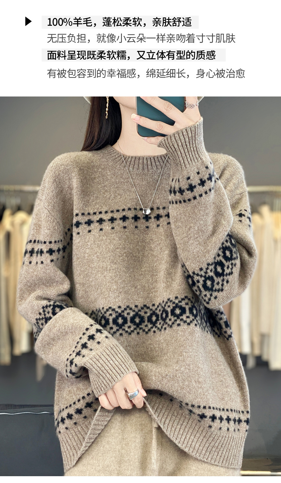 100%纯羊毛2025秋冬新款女式宽松圆领复古加厚套头打底针织衫毛衣
