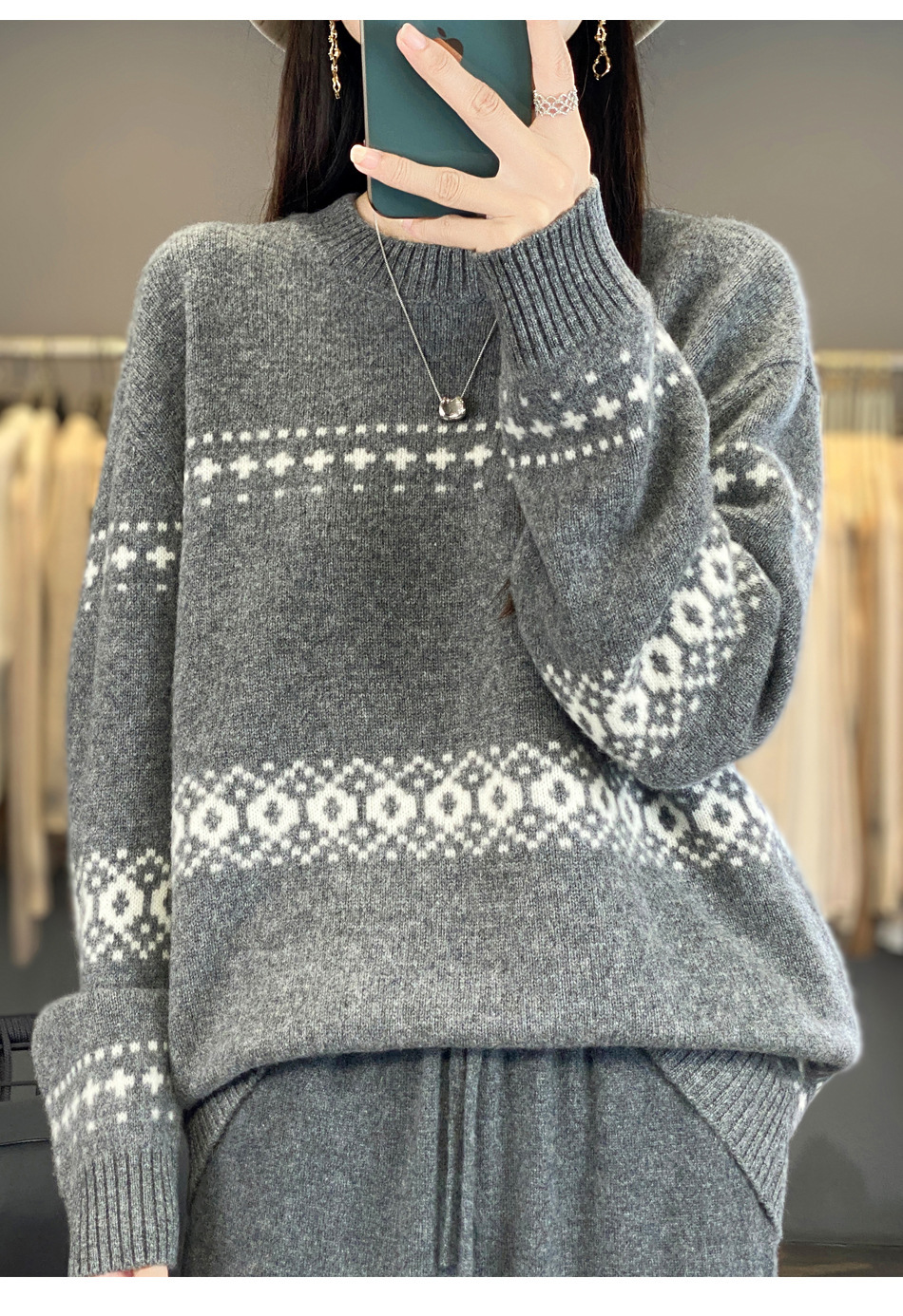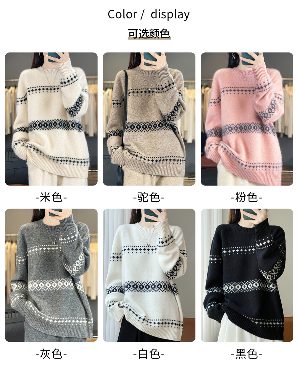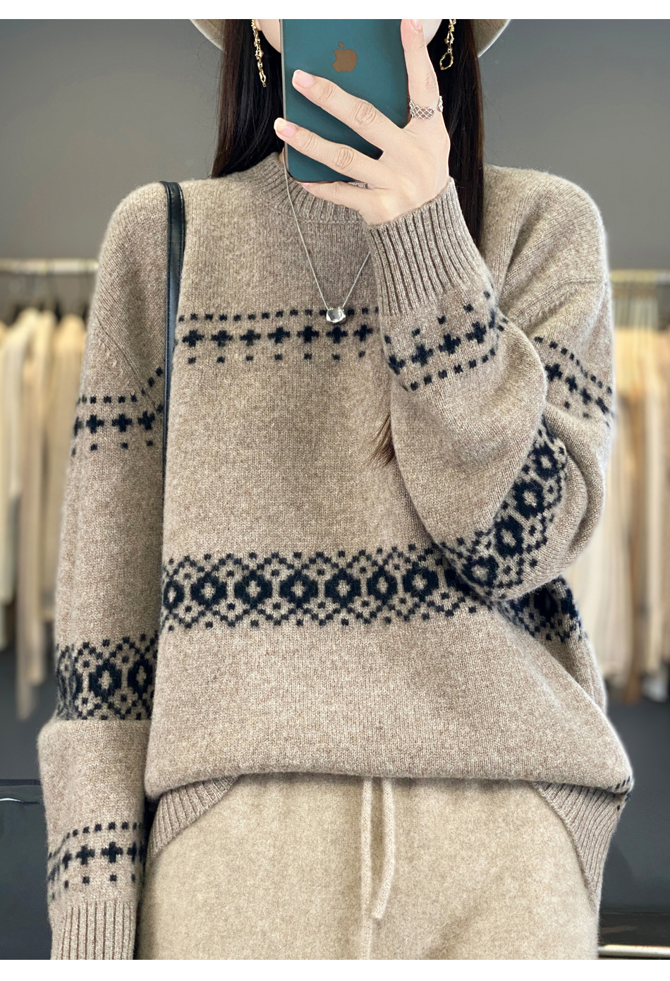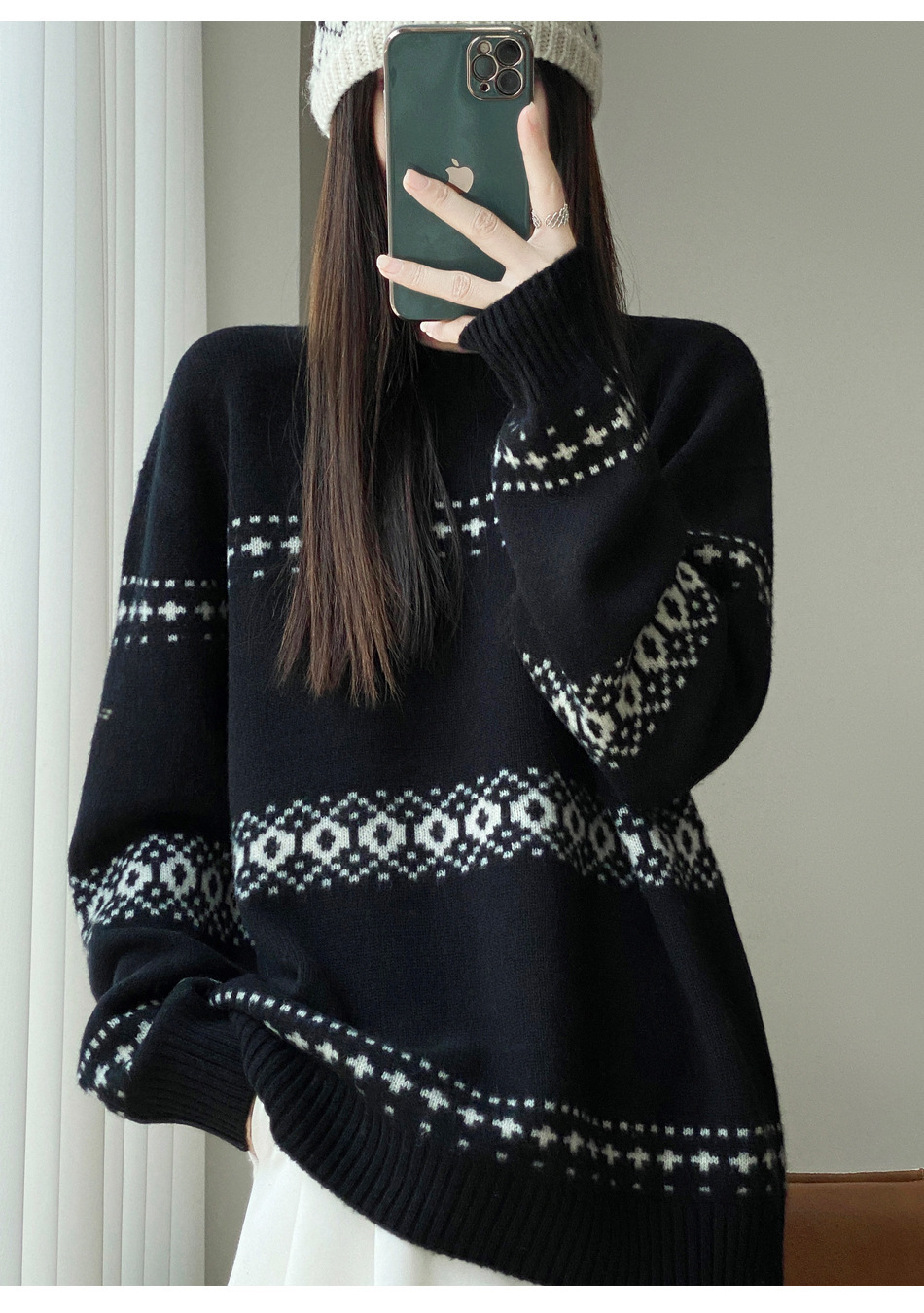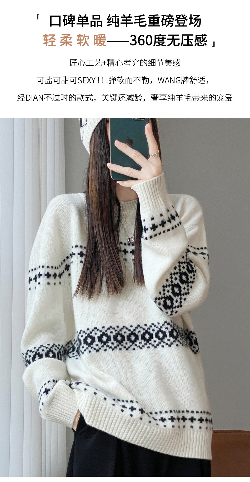 100%羊毛2025秋冬新女士宽松高领复古提花撞色套头打底针织衫毛衣