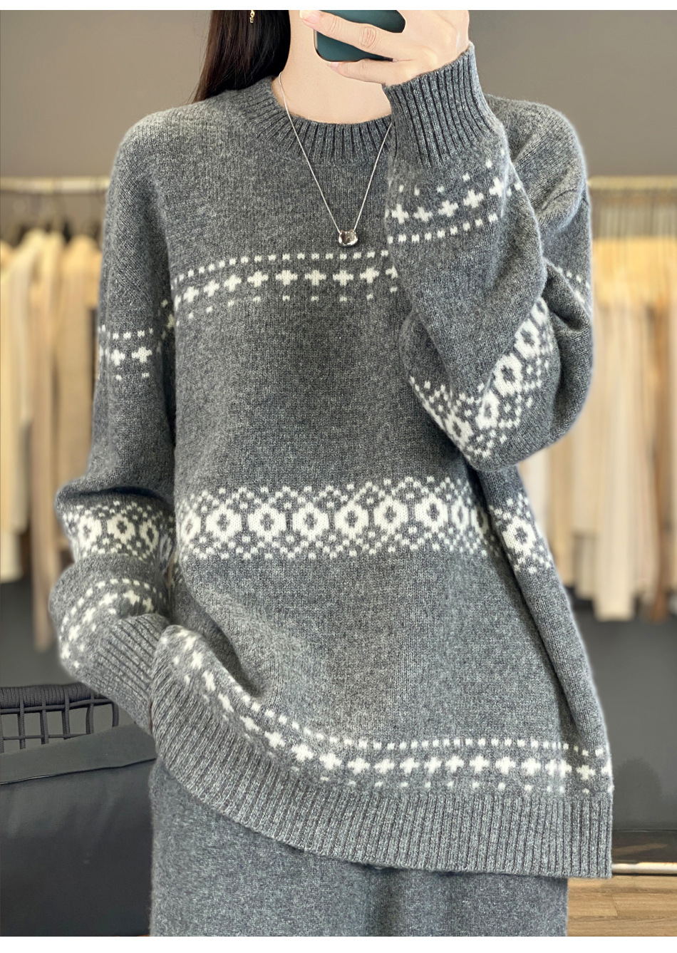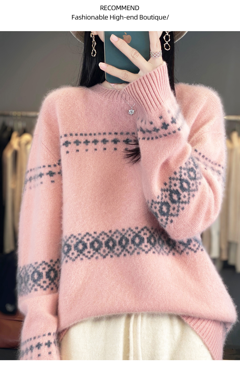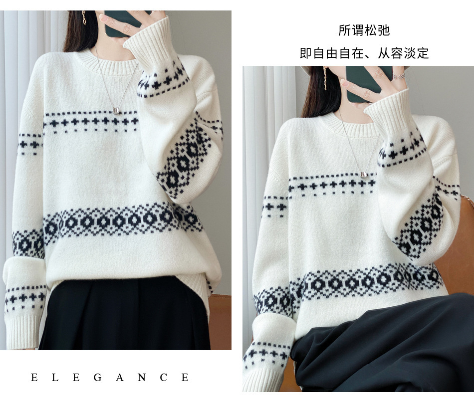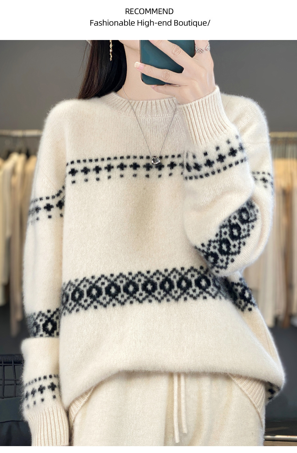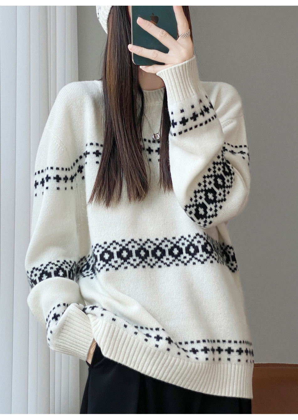 100%羊毛2025秋冬新女士宽松高领复古提花撞色套头打底针织衫毛衣