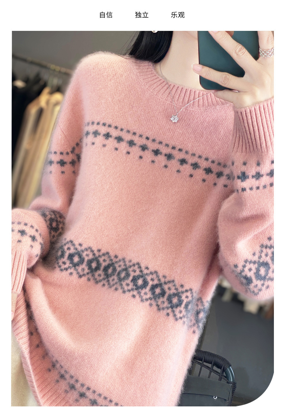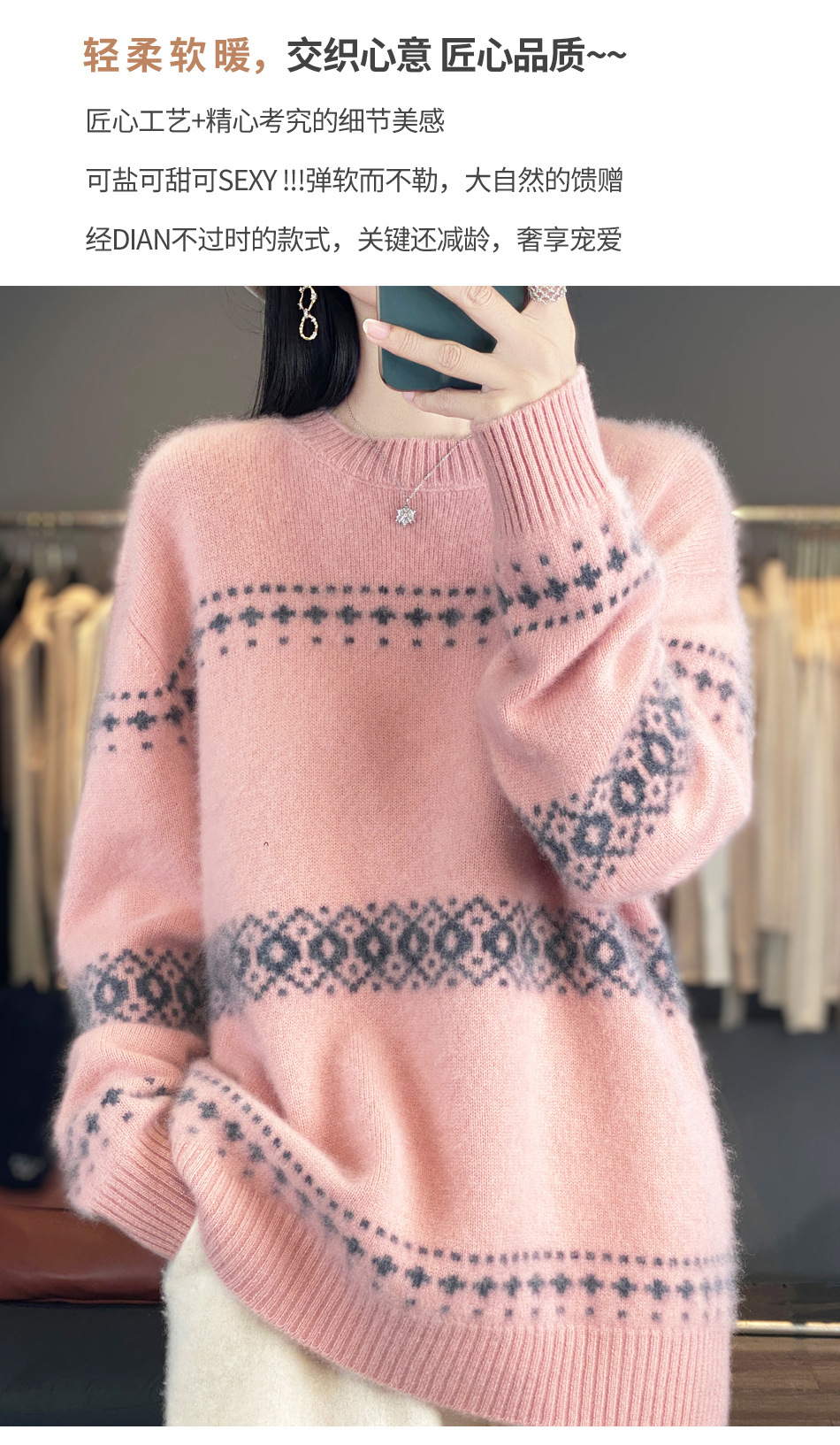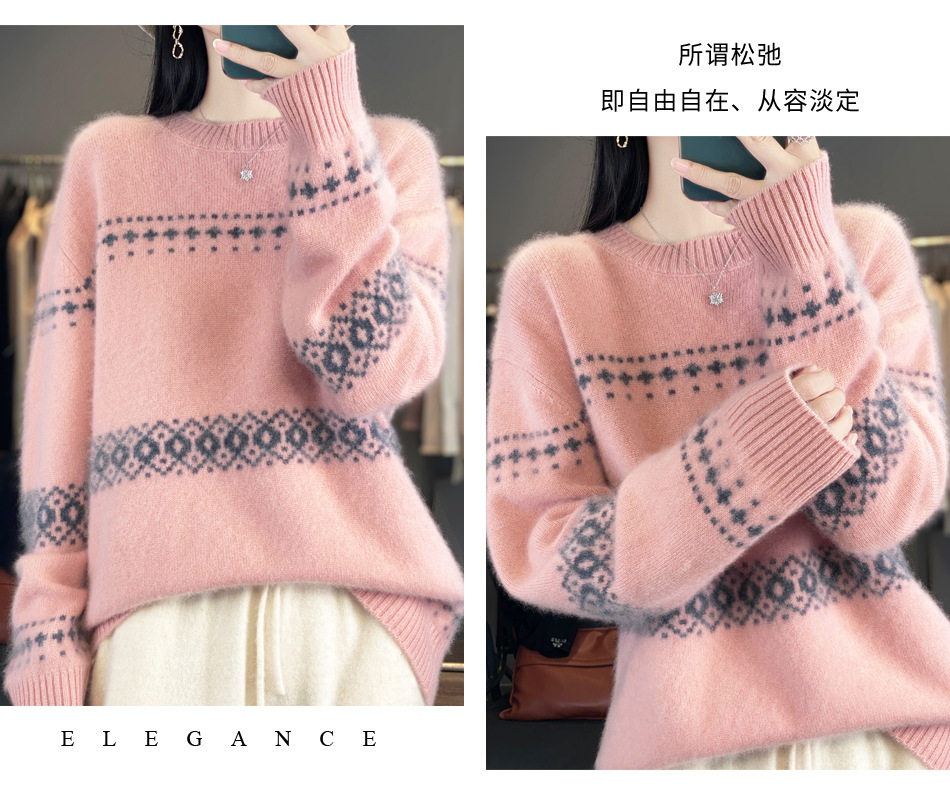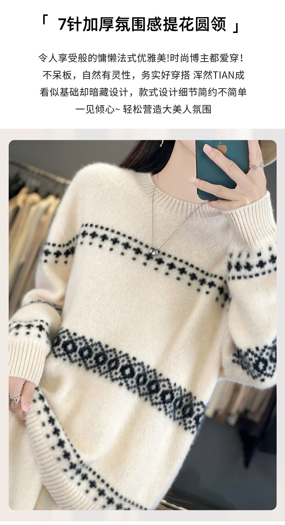 25新款拉绒羊毛衫女重工提花厚款羊绒圆领毛衣针织衫宽松打底上衣
