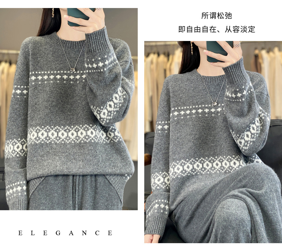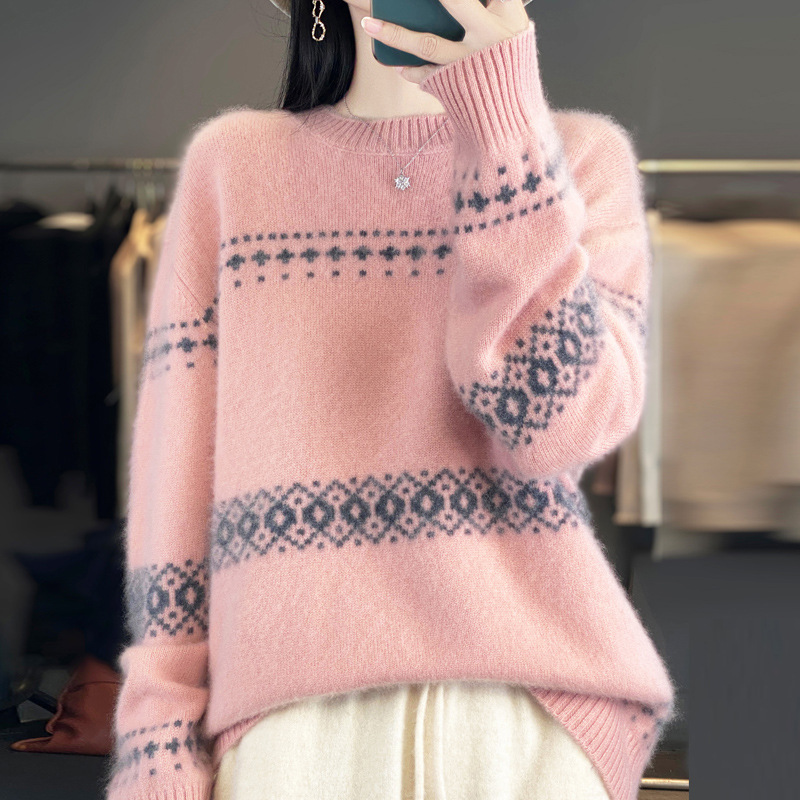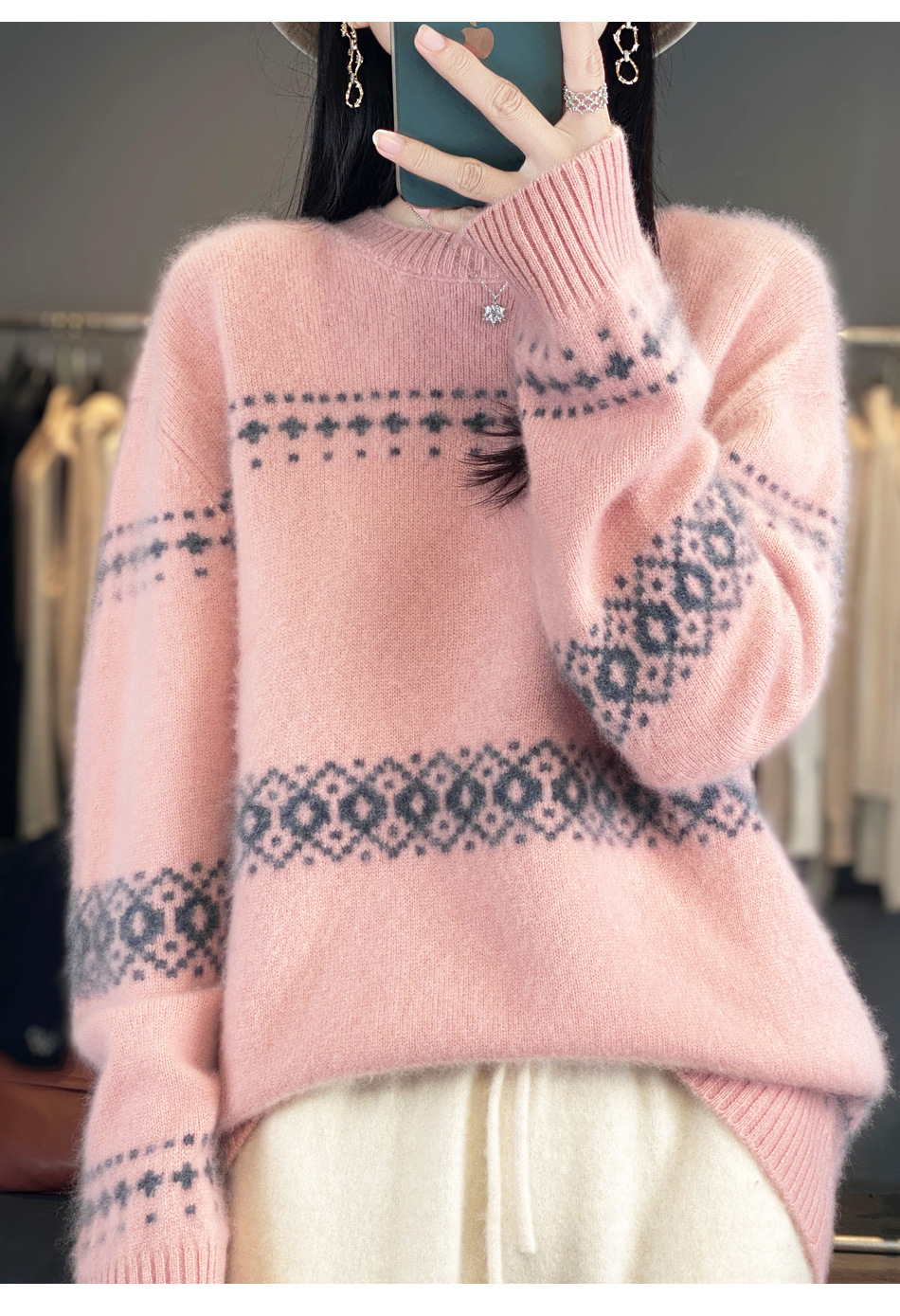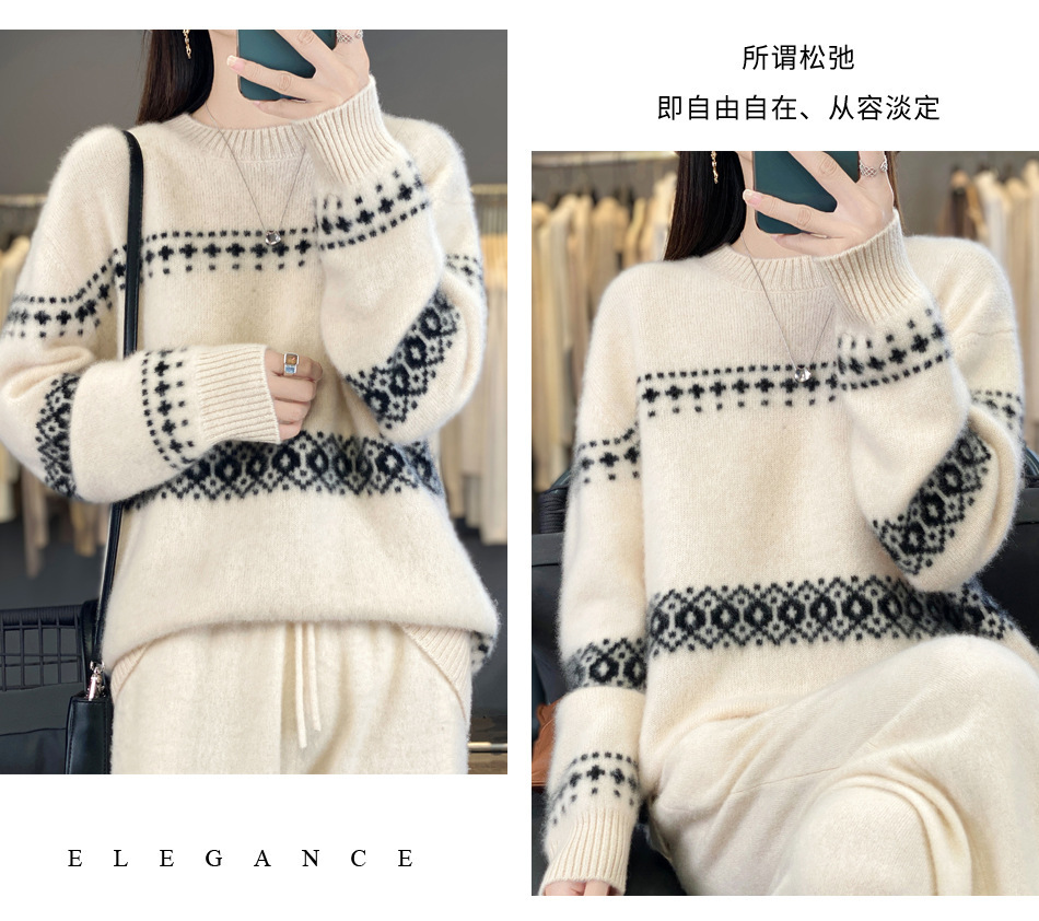 25新款拉绒羊毛衫女重工提花厚款羊绒圆领毛衣针织衫宽松打底上衣