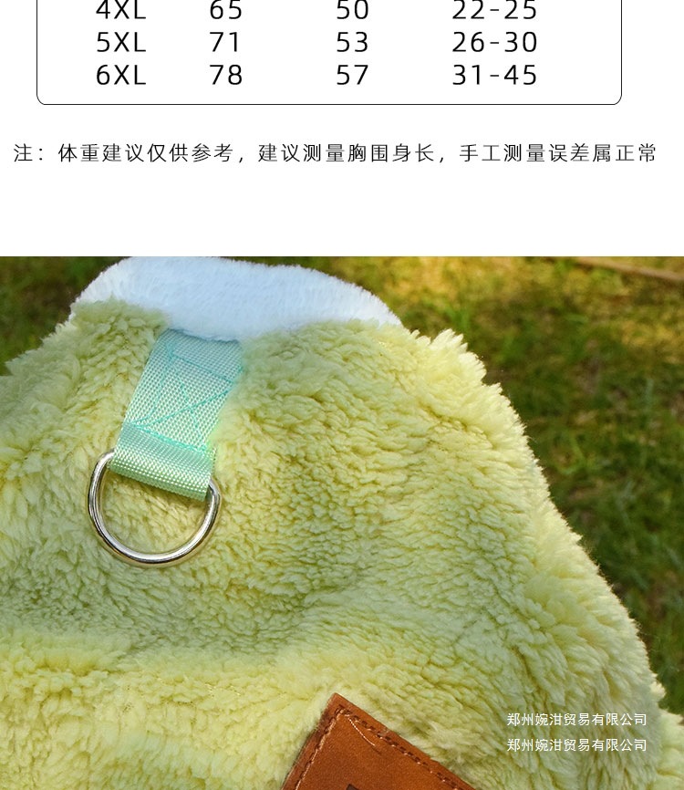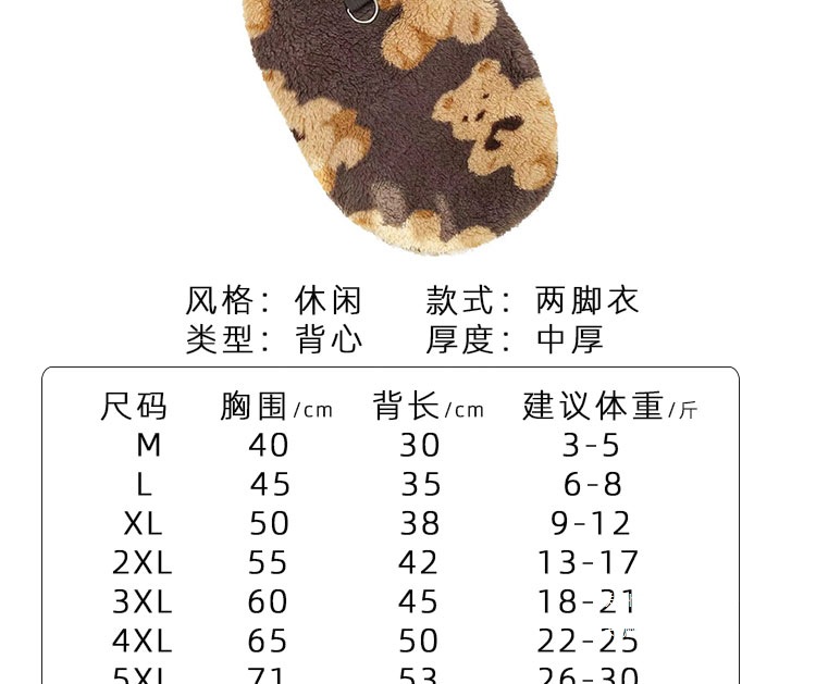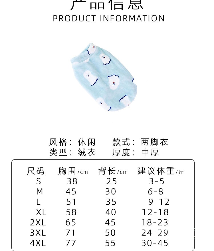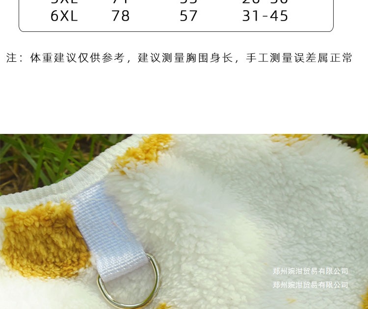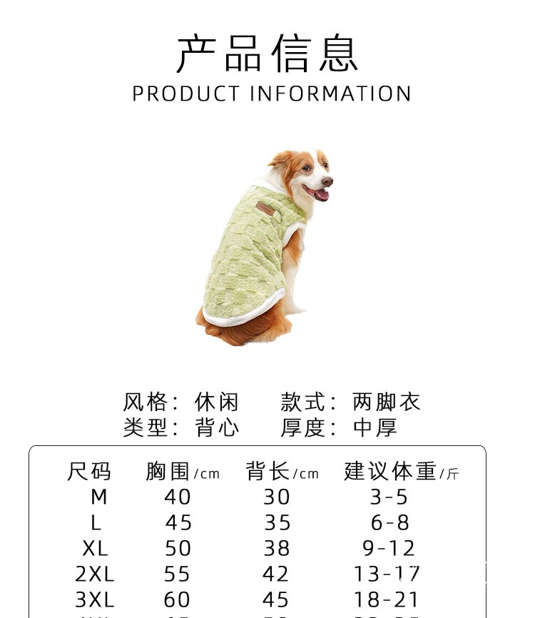 尺码 1:建议4-6斤:胸围40cm,2:建议7-9斤:胸围45cm,3:建议10-14斤:胸围50cm,4:建议15-18斤:胸围55cm,5:建议19-23斤:胸围60cm,6:建议24-28斤:胸围65cm,7:建议29-34斤:胸围71cm,8:建议35-45斤:胸围78cm
