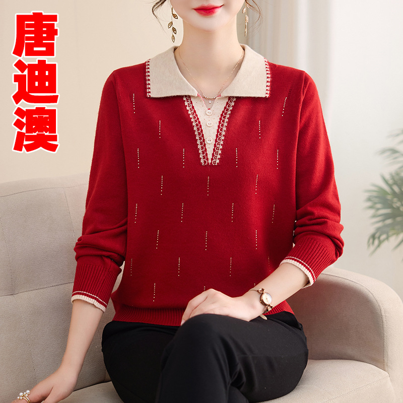 妈妈秋装新款洋气针织打底衫2025中老年女装春秋翻领长袖套头毛衣