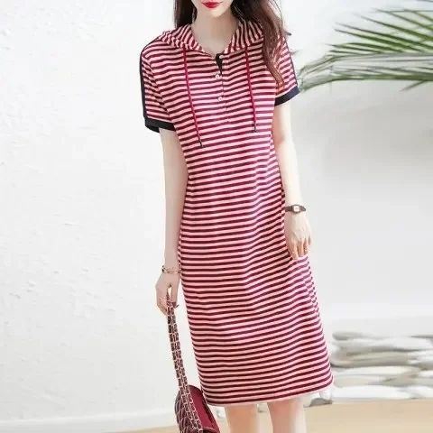 半袖ワンピース女性夏2025年夏女性モデル優雅ファッションストライプ帽子付きゆるい中長衝突色スカート