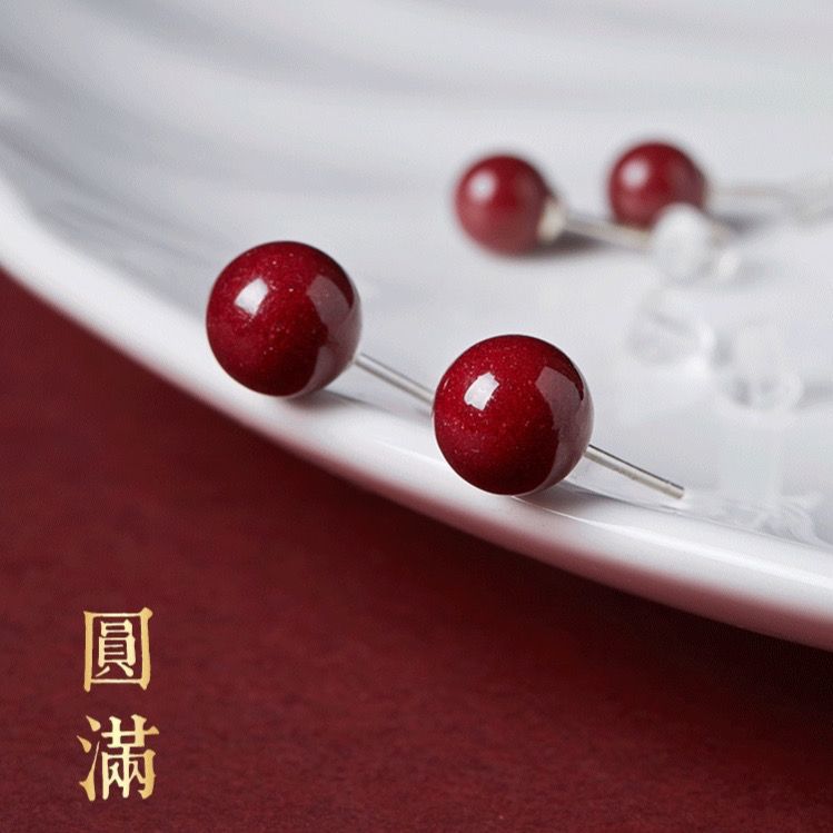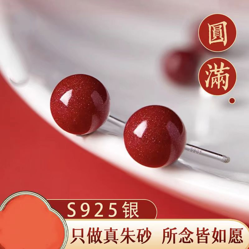 保真朱砂s925銀ピアス紫砂円珠金女紅本命年耳落ち高気質カップル祭りプレゼント