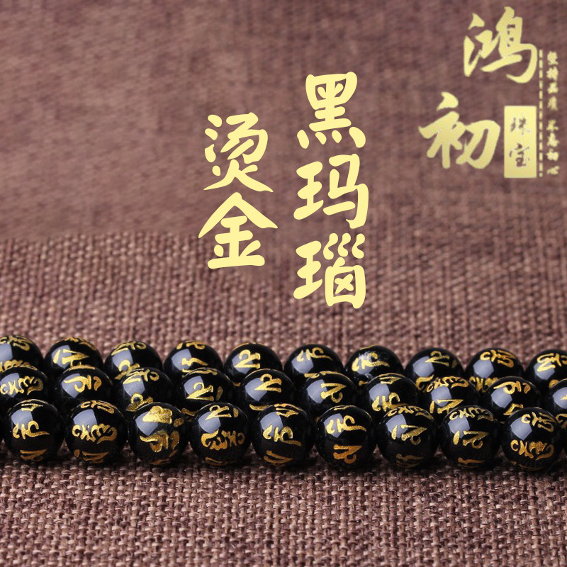 批发天然黑玛瑙烫金六字真言箴言散珠子圆珠diy半成品手工珠配件