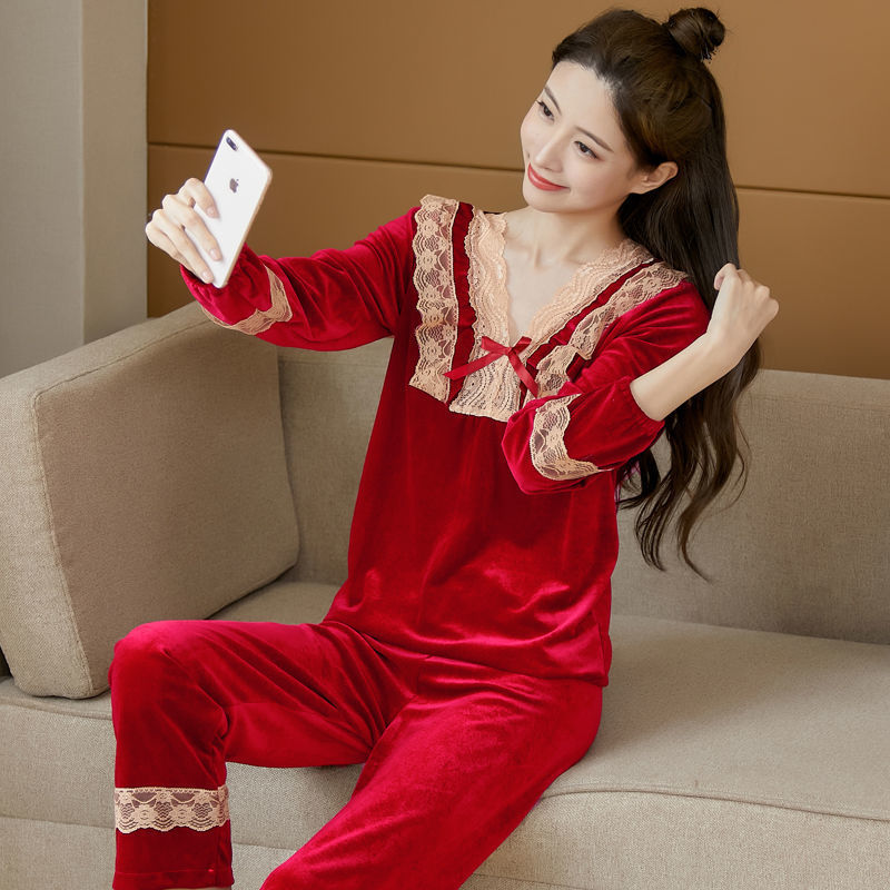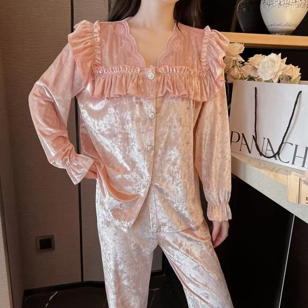 春と秋の女性のパジャマ冬のネットの赤い生放送の爆発金のベルベットの軽い贅沢な風のレースの金のドリルのベルベットの家の服