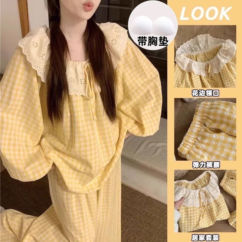 云朵棉睡衣女款长袖春秋季甜美可外穿家居服带胸垫套装外贸批发
