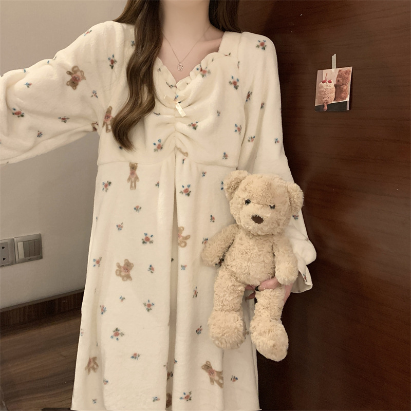 胸パッド付き冬寝スカート女子の膝を越えた長袖の厚いベルベットのフランネル280グラムパジャマの清新な家庭服