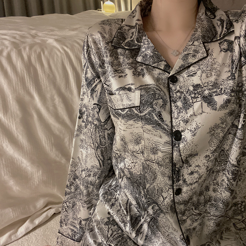 パジャマの女性の春の新型のシンプルな水墨画のレトロな文芸の長袖のズボンの氷の糸の襟のカーディガンの部屋の服