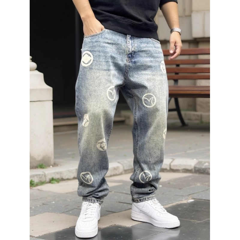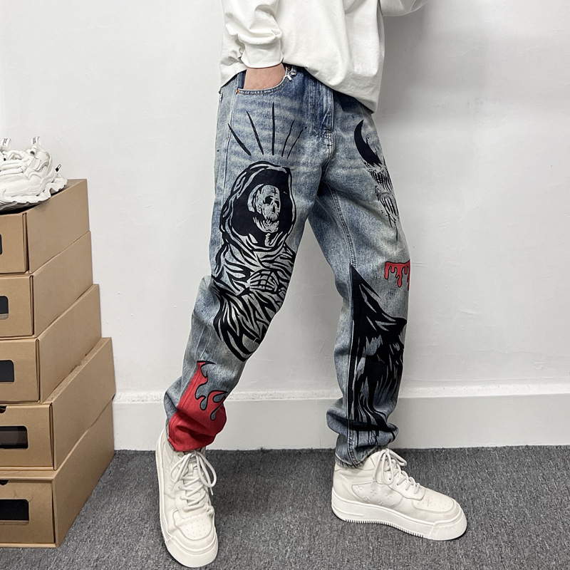 アメリカのハイストリートヘビーデューティープリントグラフィティジーンズ、若者向け、トレンディ、ハンサム、カジュアル、ルーズ、マイクロテーパードパンツ