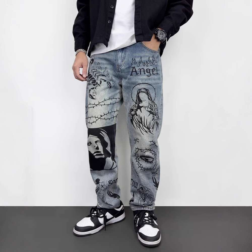 レトロジーンズメンズアニメ絵画落書きハイエンドトレンディブランドルーズテーパード2025アメリカンハイストリート春夏パンツ