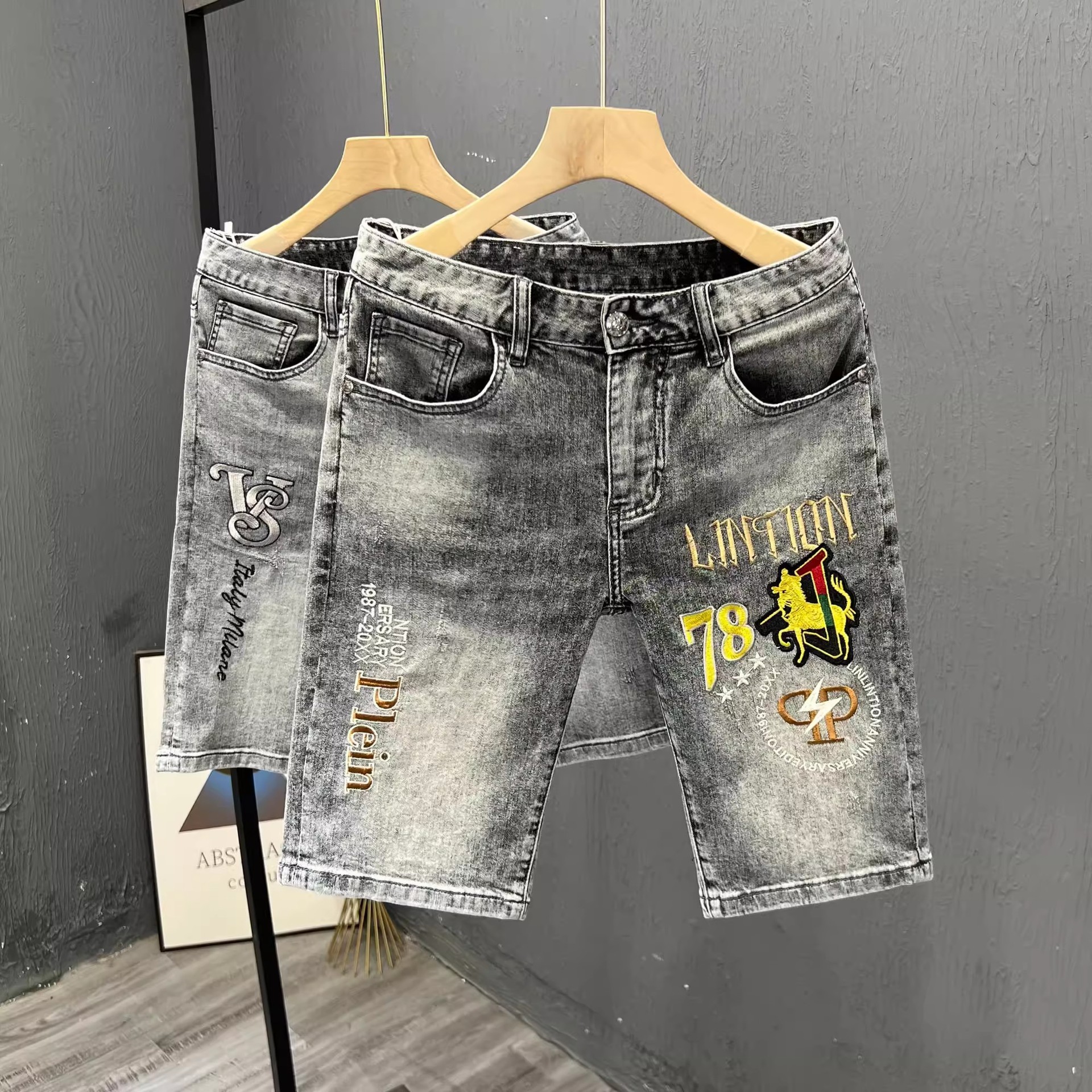 高級刺繍ストレッチメンズデニムショートパンツ夏のトレンディなミッドパンツスリム韓国スタイルストレートファッション5点パンツ