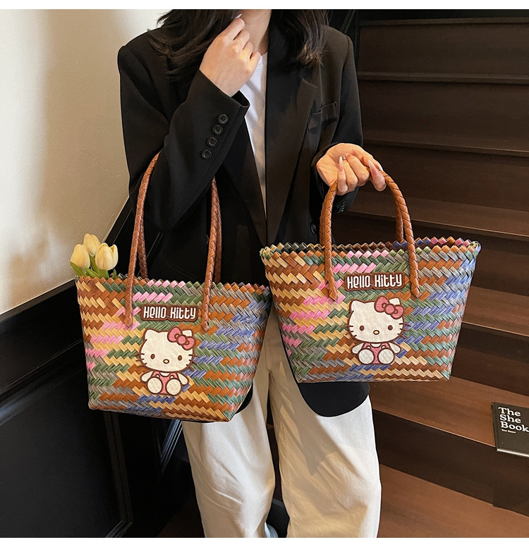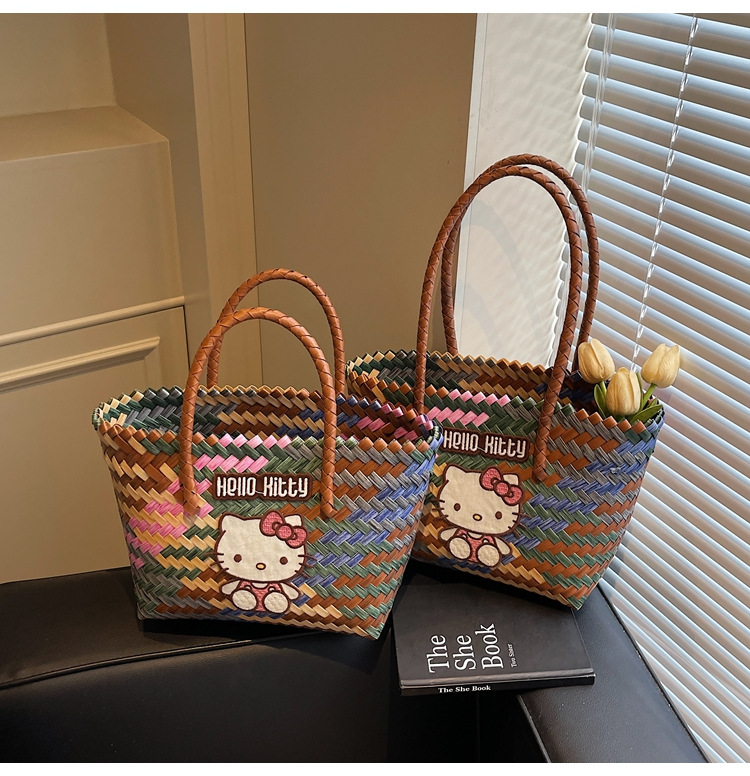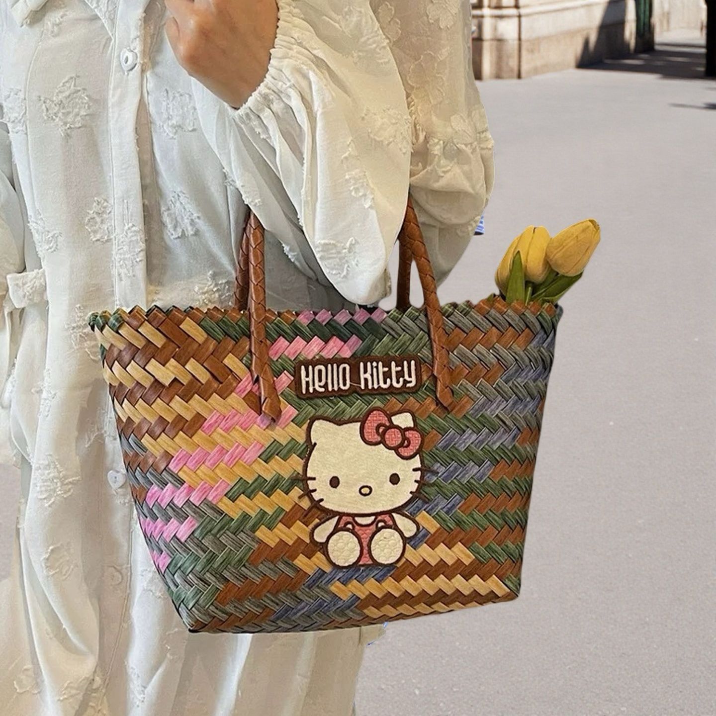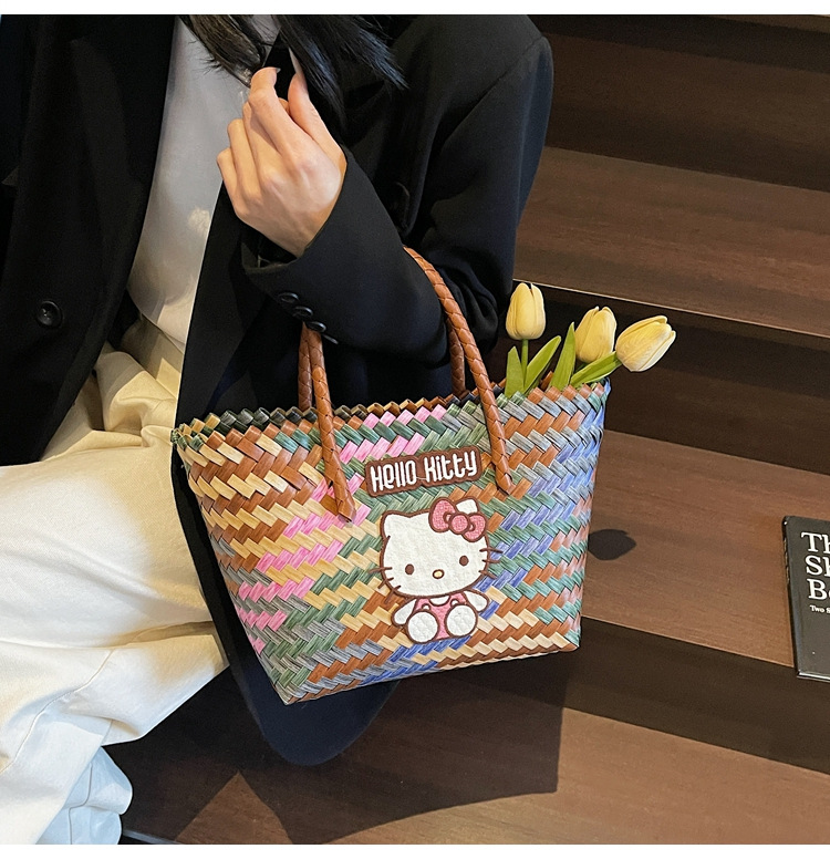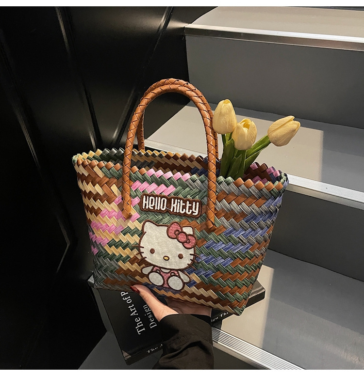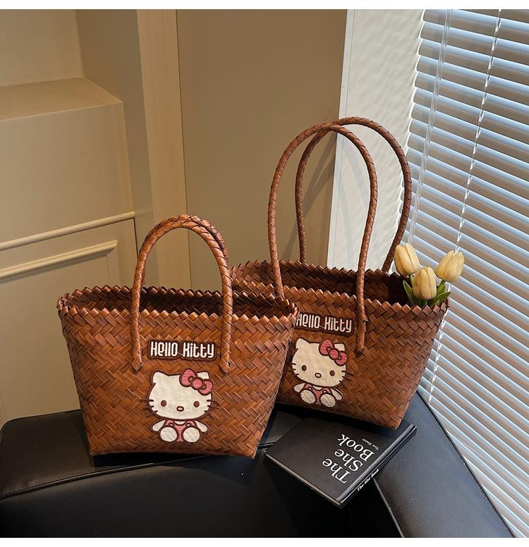 卡通kt猫手提菜篮子编织包女夏天海边度假风藤编通勤包手拎沙滩包