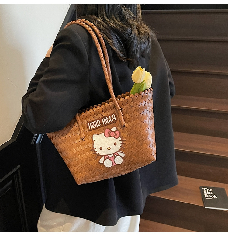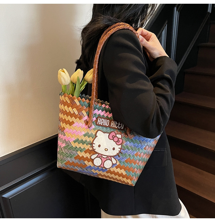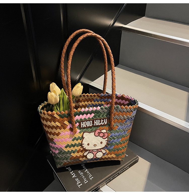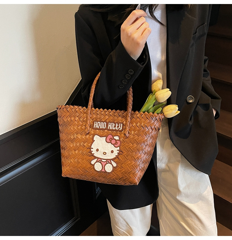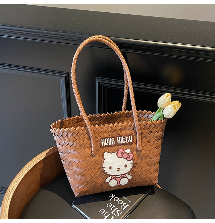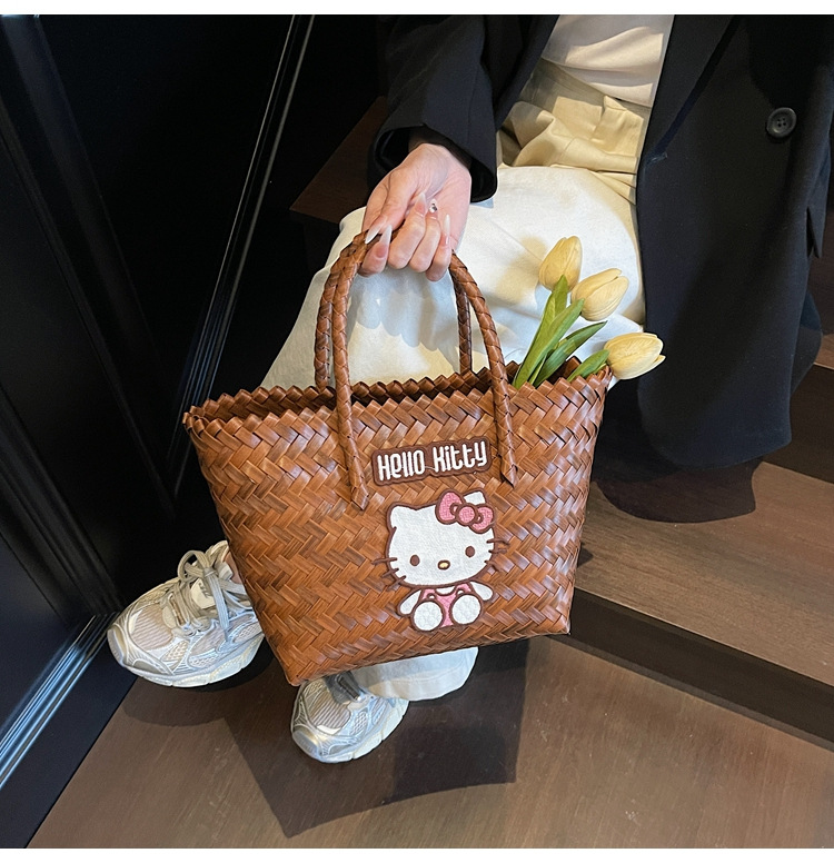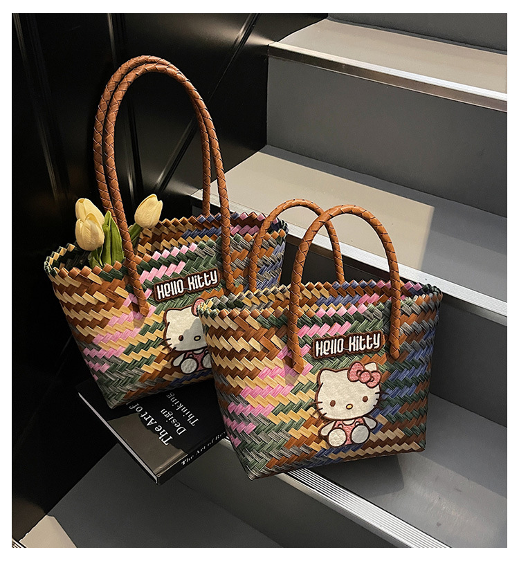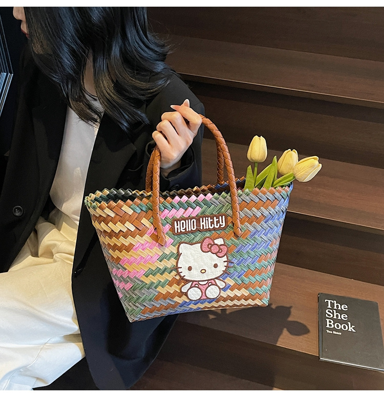 卡通kt猫手提菜篮子编织包女夏天海边度假风藤编通勤包手拎沙滩包