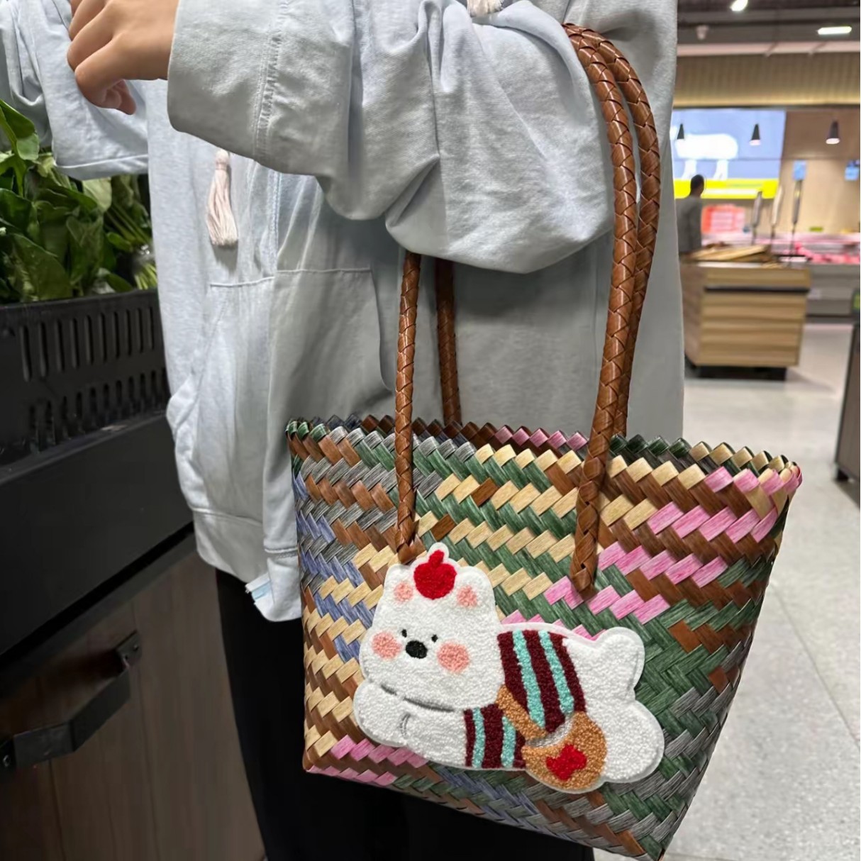新款腊肠狗棕色彩色敞口编织篮子通勤托特包伴手礼品篮子藤编篮子