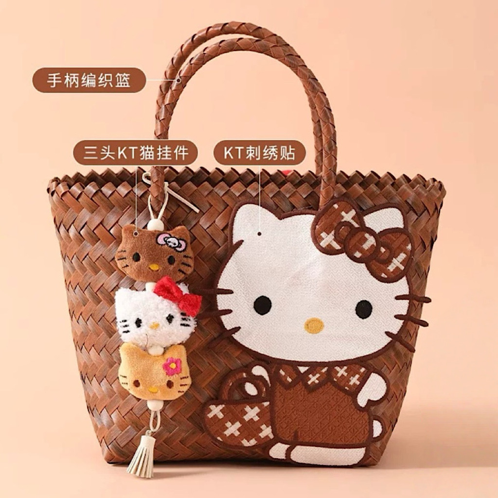 KT复古仿藤编手工编织菜篮子可爱卡通猫咪手提伴手礼草编包沙滩包