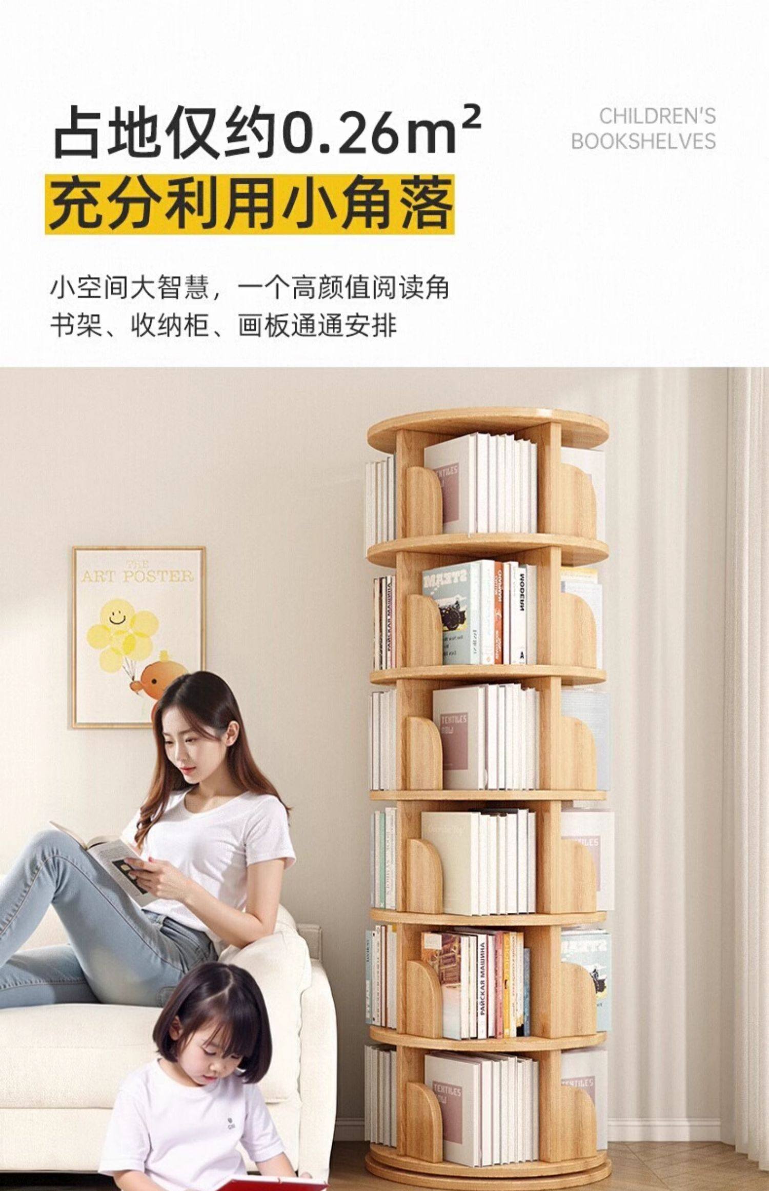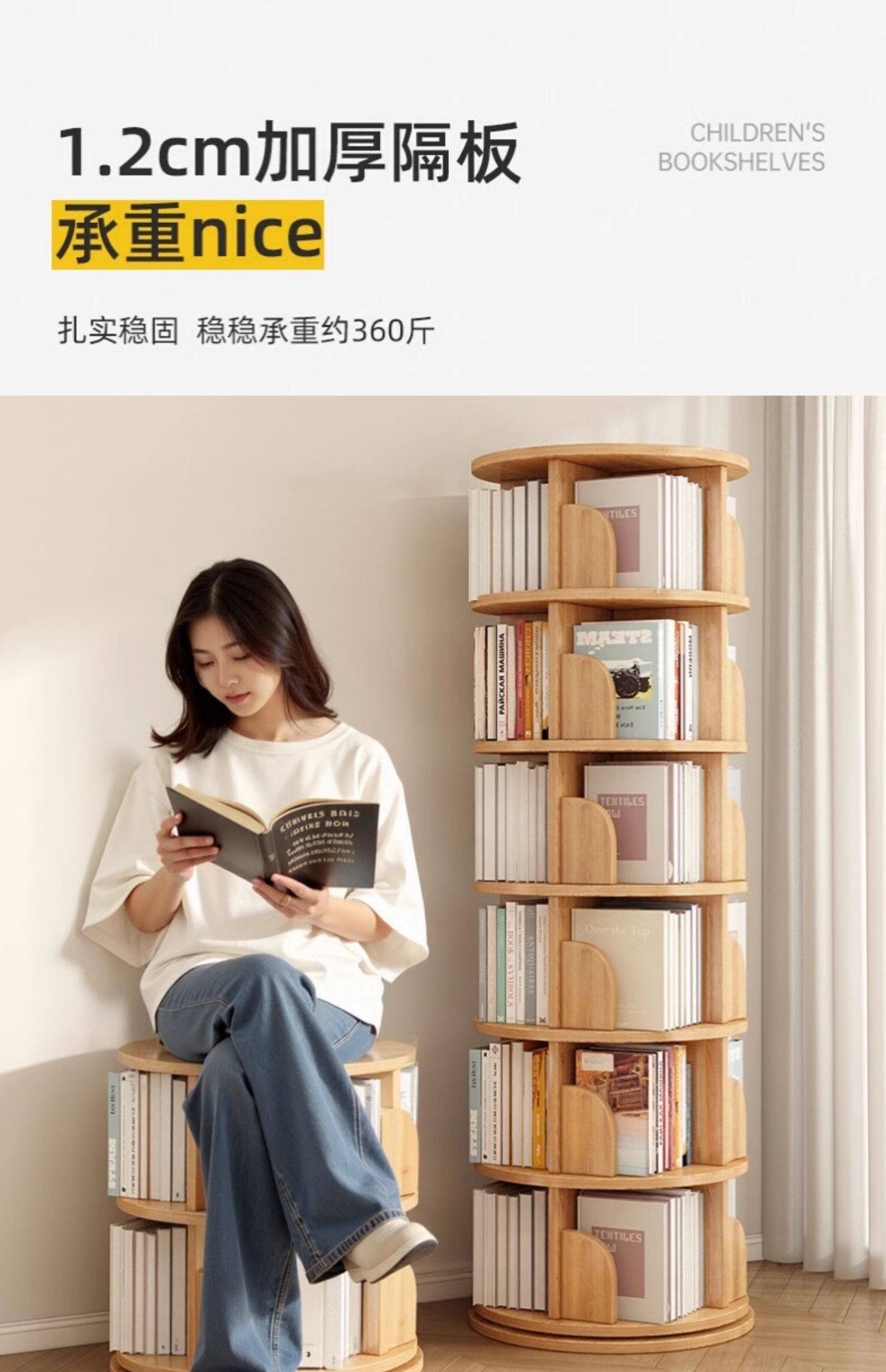 360度回転式木製本棚、省スペース、子供用フロア絵本棚、家庭用学生用簡易収納棚