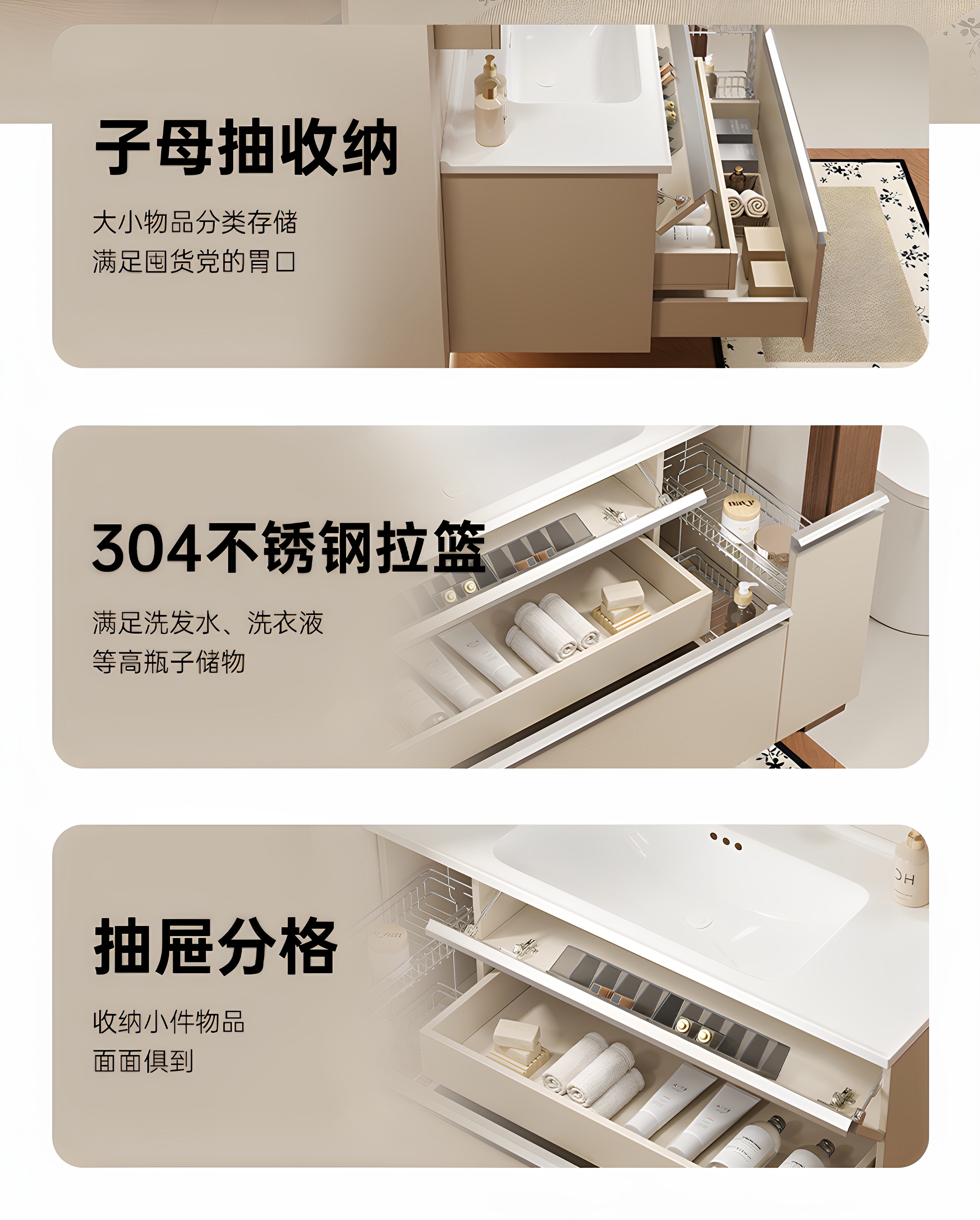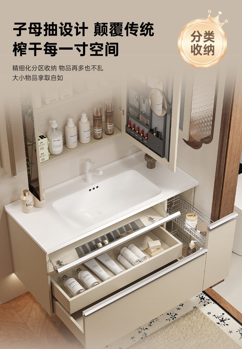 新款日式奶油风实木带拉篮浴室组合陶瓷一体盆卫生间洗漱台洗脸盆