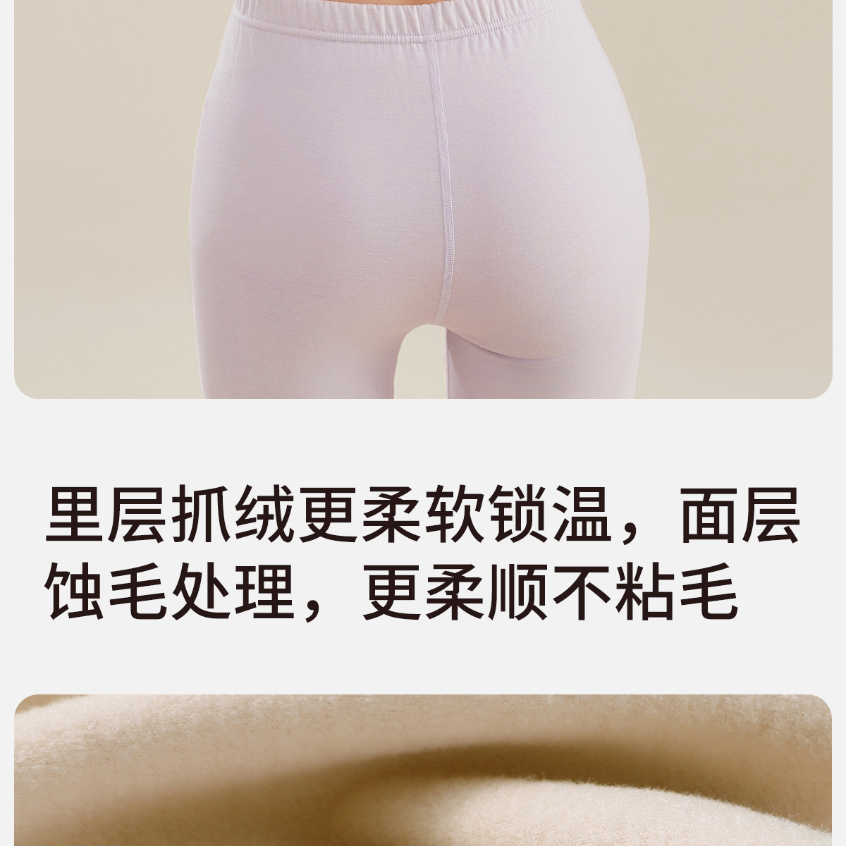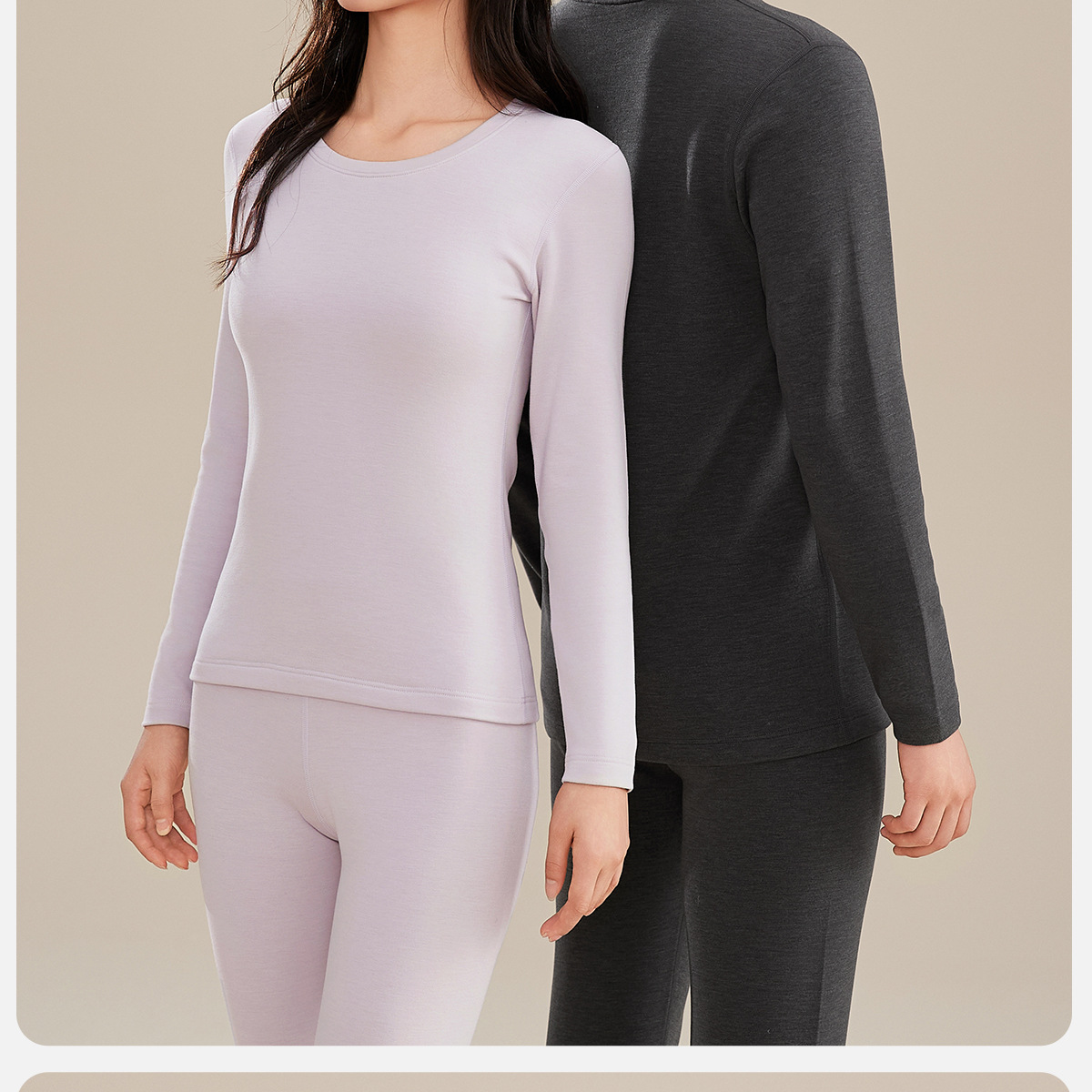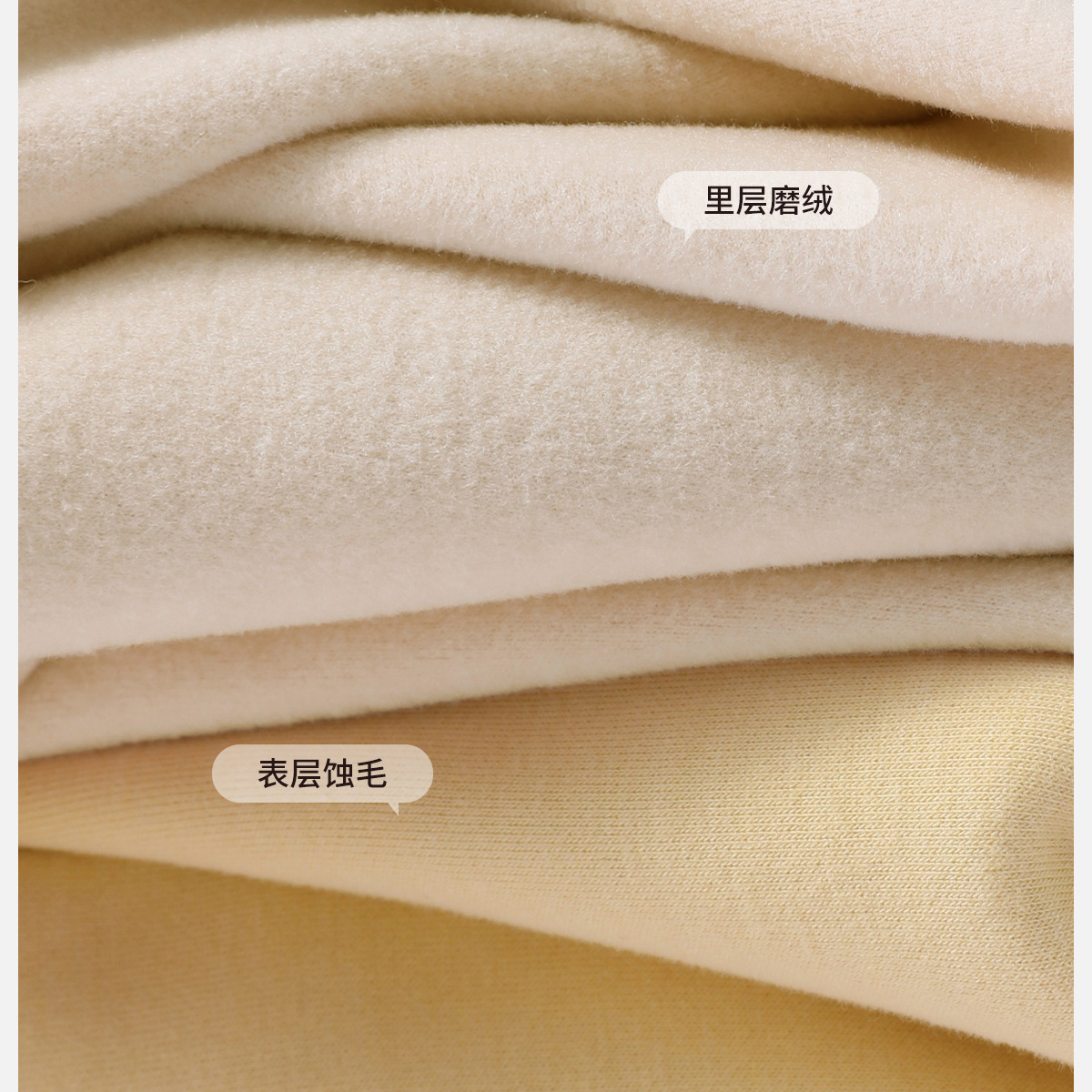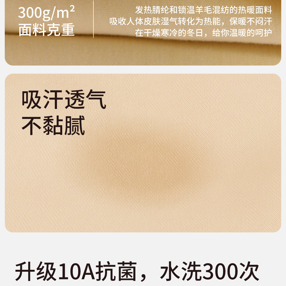 300g/㎡加厚德绒保暖套装,里层磨绒,更保暖。含羊毛、莫代尔适合冬季贴身穿。面层蚀毛工艺,不易粘毛、不易起球,10A抗菌防螨,更健康。蚕丝蛋白滋养,更适合冬季。