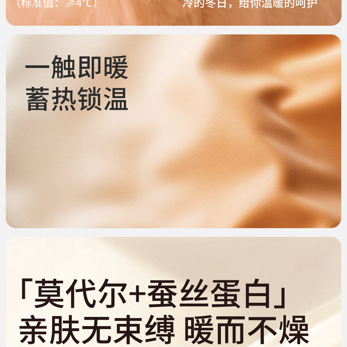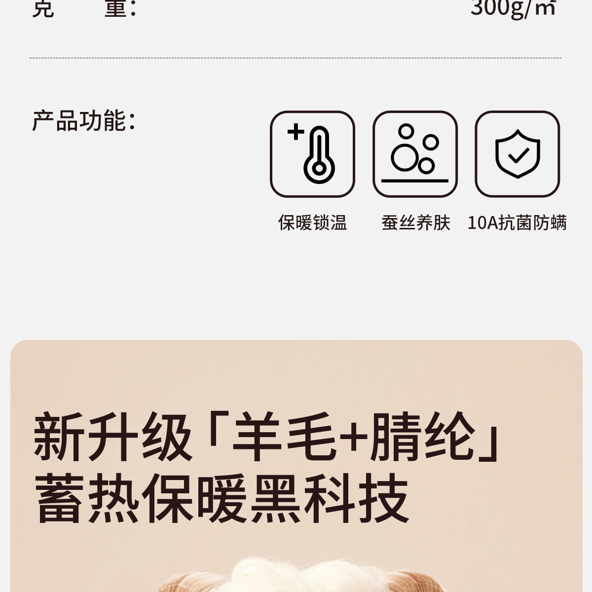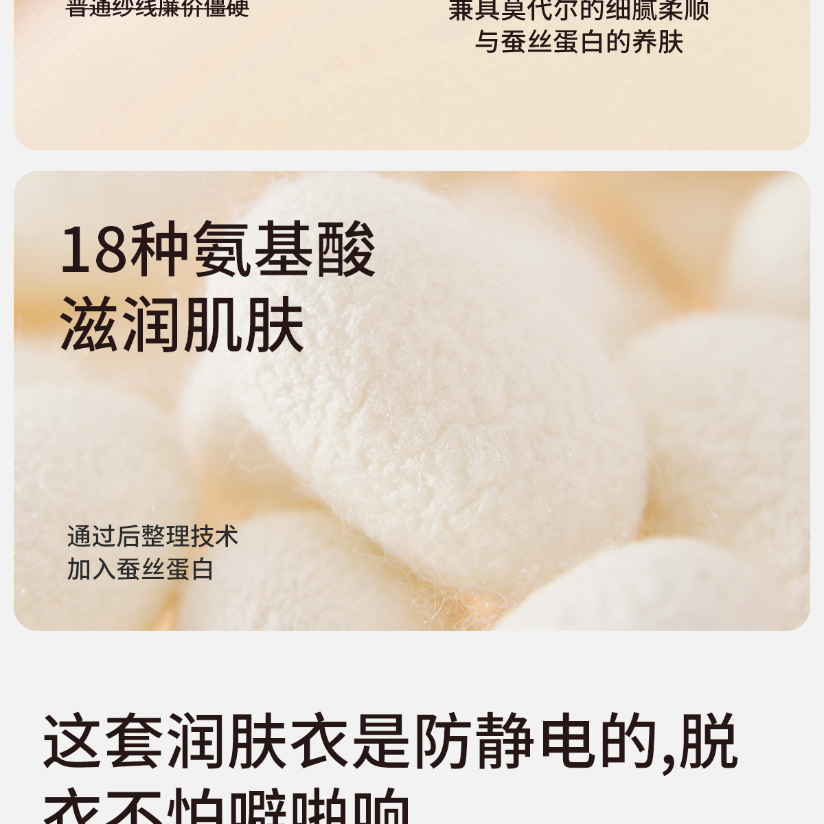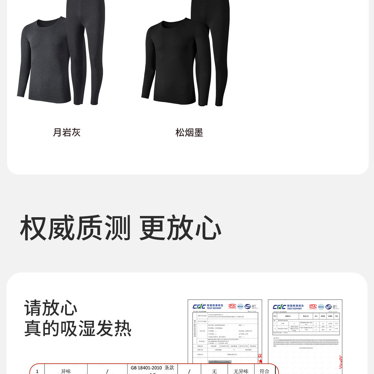 300g/㎡加厚德绒保暖套装,里层磨绒,更保暖。含羊毛、莫代尔适合冬季贴身穿。面层蚀毛工艺,不易粘毛、不易起球,10A抗菌防螨,更健康。蚕丝蛋白滋养,更适合冬季。