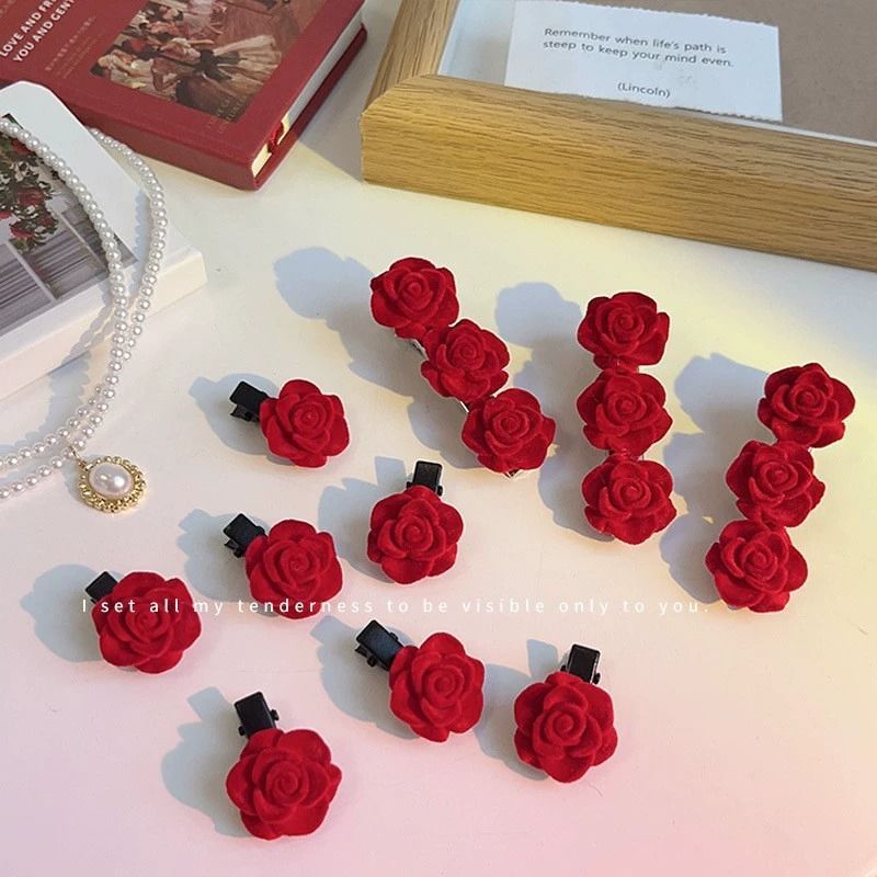 露のバラの赤いバラの花のヘアピンのサイドの前髪の砕いたヘアピンの婚約ドレスの女性の髪飾りのカモの口のクリップ