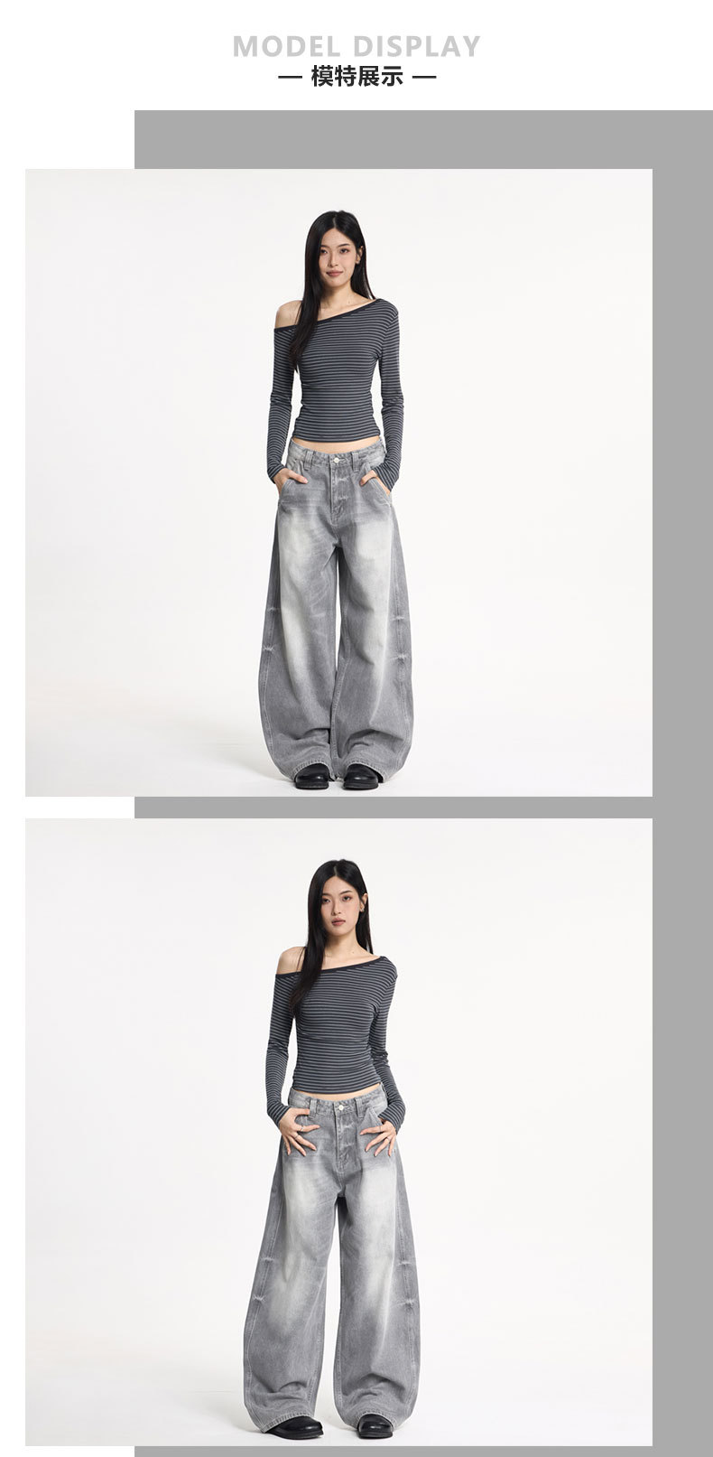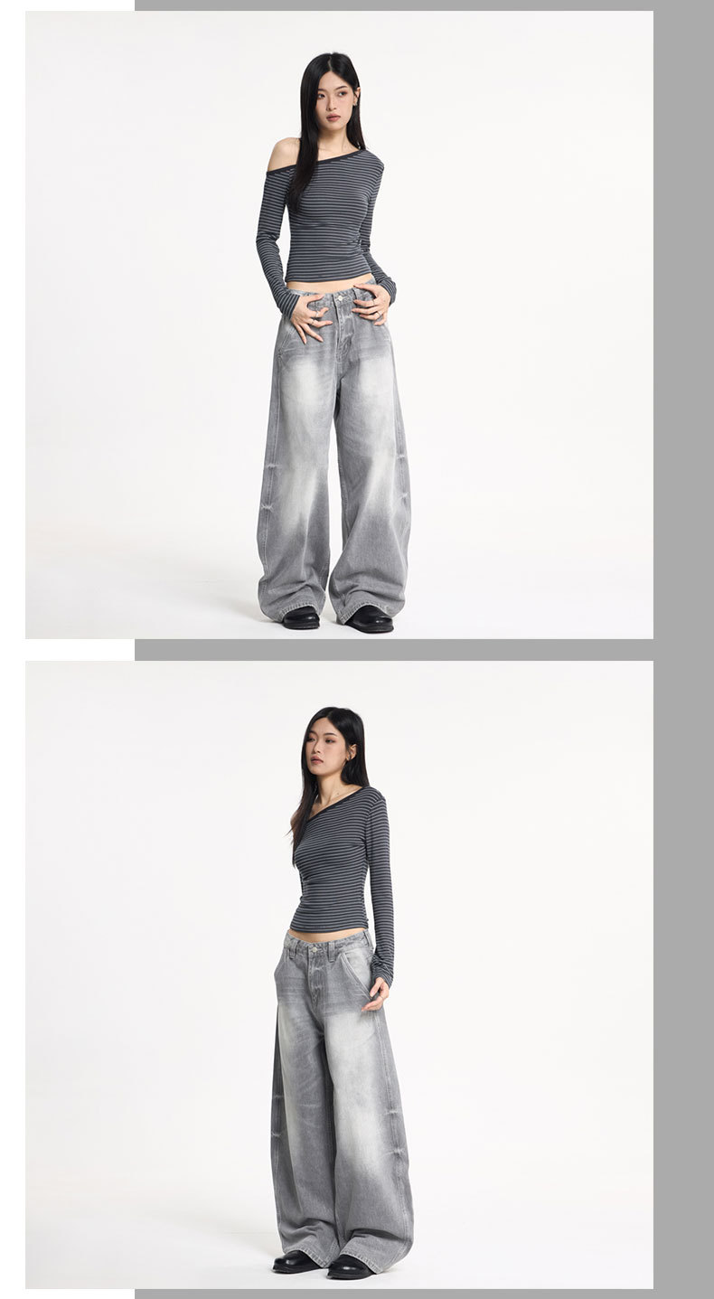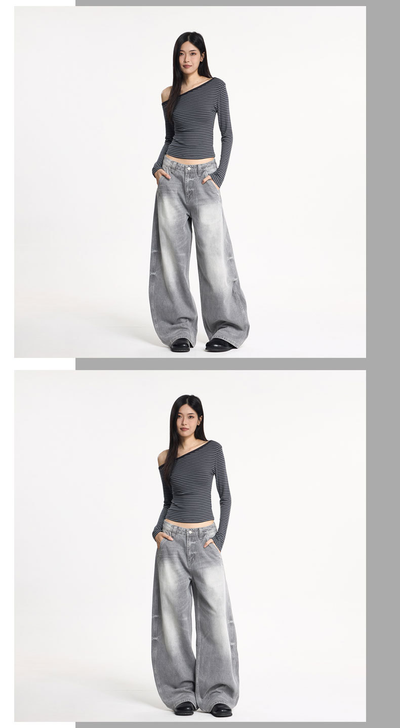 JIAMU灰色美式高街baggy jeans中性阔腿牛仔裤男女宽松廓形香蕉裤