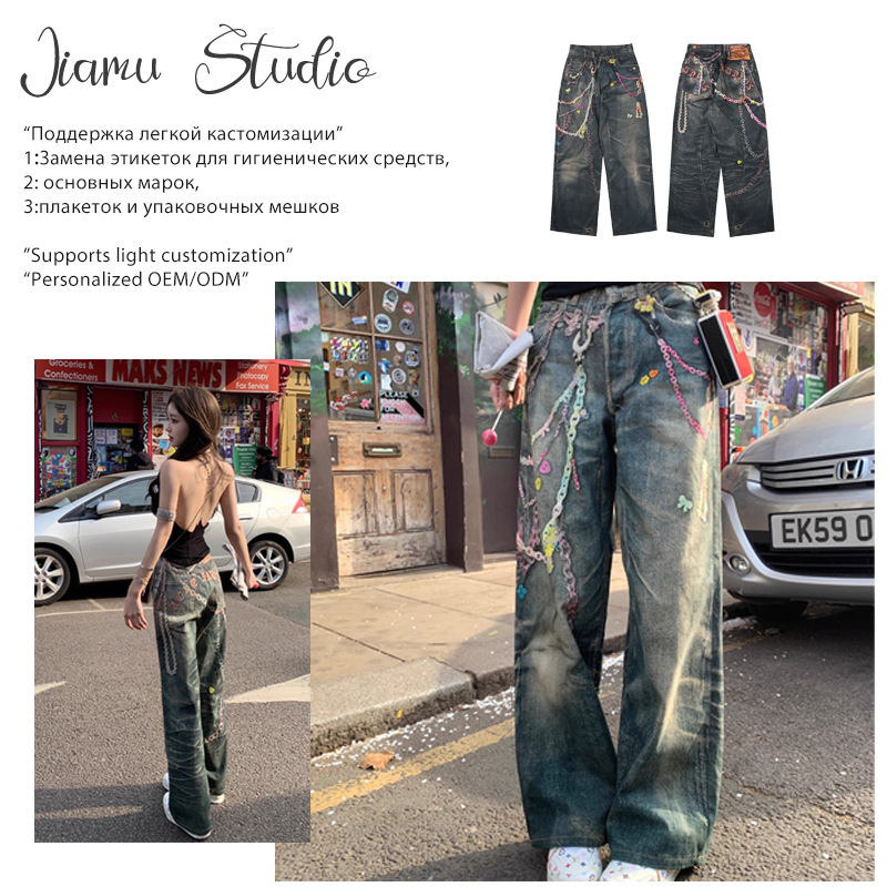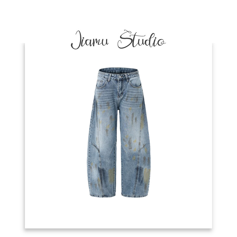 JIAMU キャットウィスカー スプラッシュインク アメリカン バギー ジーンズ ユニセックス シミターデニム ジーンズ メンズ レディース ルーズ ワイドレッグ シモトパンツ