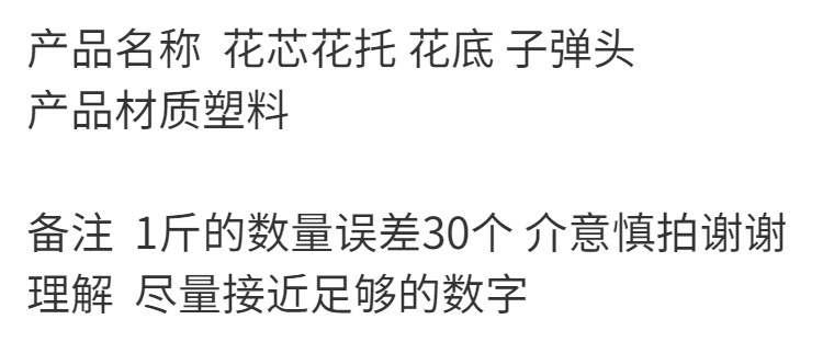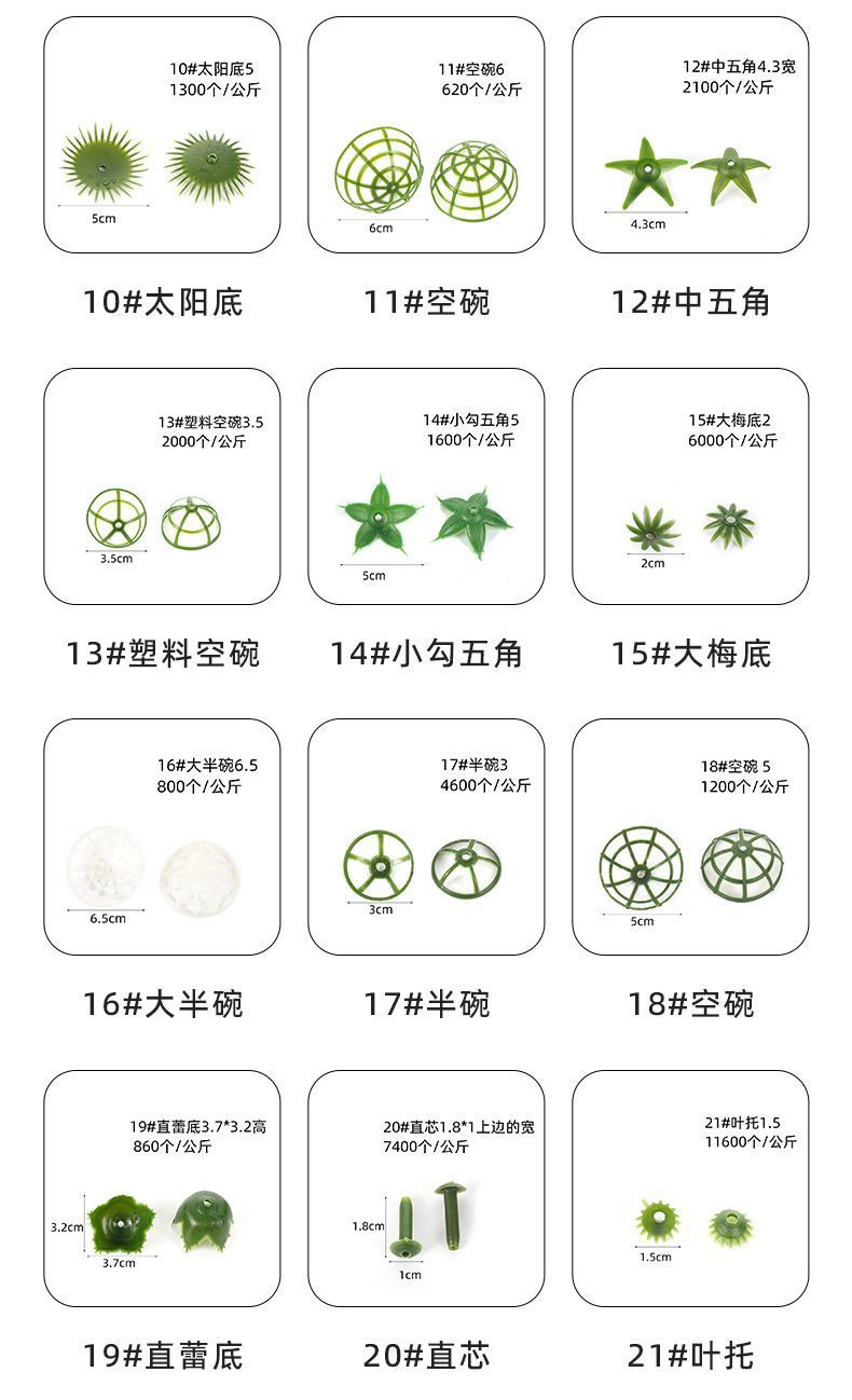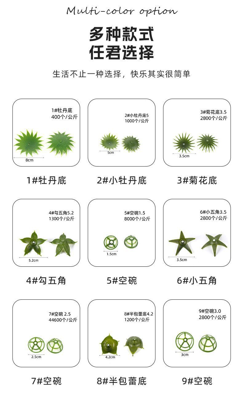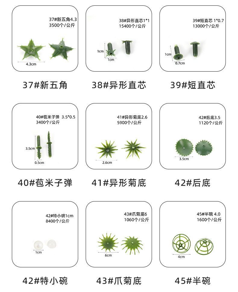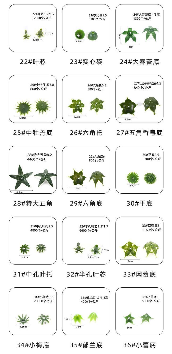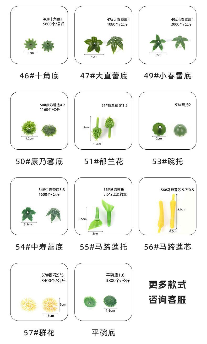 颜色 1*牡丹底,2*小牡丹底,3*菊花底,4*钩五角,5*空碗,6*小五角,7*空碗,8*半包蕾底,9*空碗,10*太阳底,11*空碗,12*中五角,13*塑料空碗,14*小钩五角,15*大梅底,16*大半底,17*半空碗,19*直蕾底,20*直芯,21*叶托,22*叶芯,23*空芯碗,24*大春雷底,25*中牡丹底,26*六角托,27*五角香皂底,28*特大五角,29*六角底,30*平底,31*中孔叶托,32*中孔叶芯,33*网蕾底,34*小梅底,35*郁兰底,36*小蕾底,37*新五角,38*异性直芯,39*短直芯,40*泡沫子弹,41*异性菊底,42*后盖,43*特小碗,44*爪菊底,18*空碗,45*半碗,46*十角底,47*大直蕾底,49*,50*康乃馨底,51*郁兰花,52*大蕾底,53*碗托,54*中春蕾底,55*马蹄莲托,平碗底
