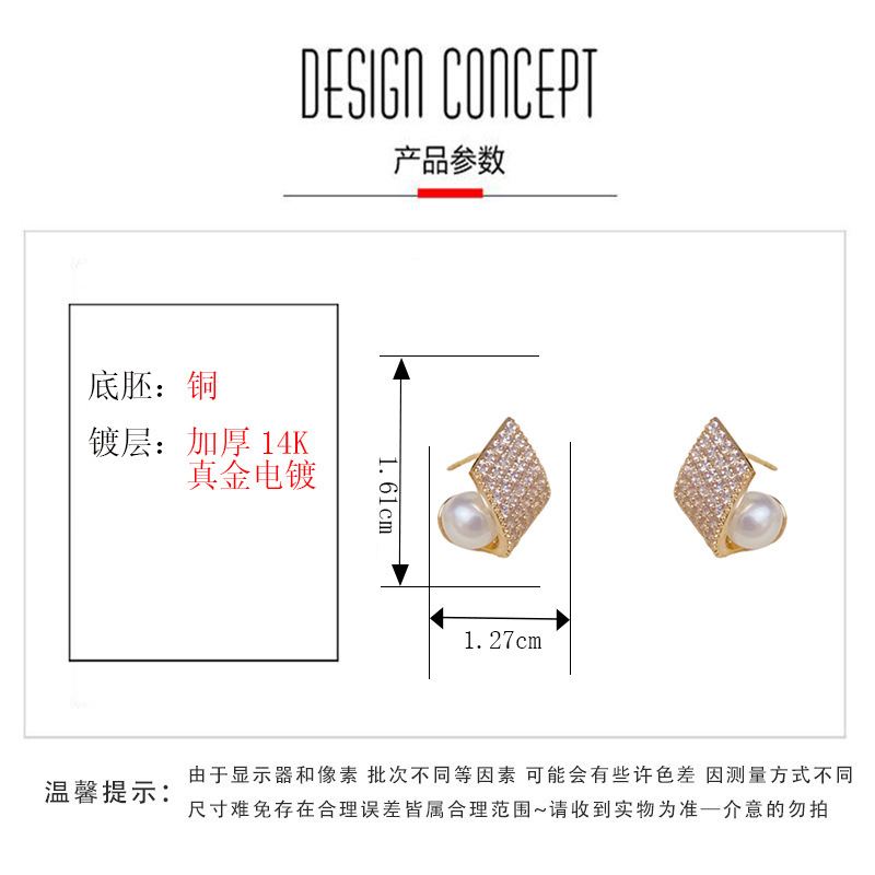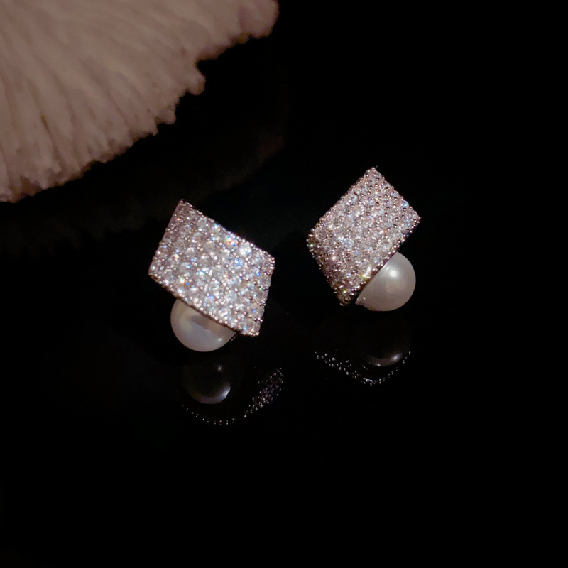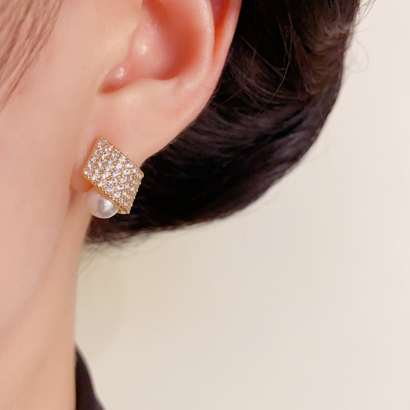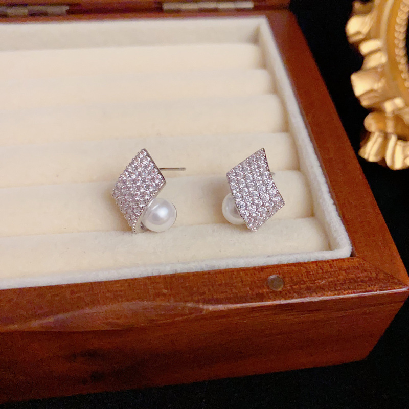 韩版时尚高级感锆石菱形珍珠耳钩女气质简约温柔百搭优雅耳坠批发