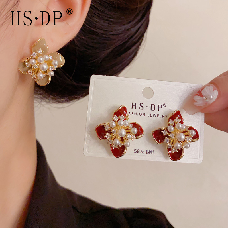法式时尚复古镶钻珍珠滴油花瓣耳环个性气质轻奢温柔百搭耳钉批发